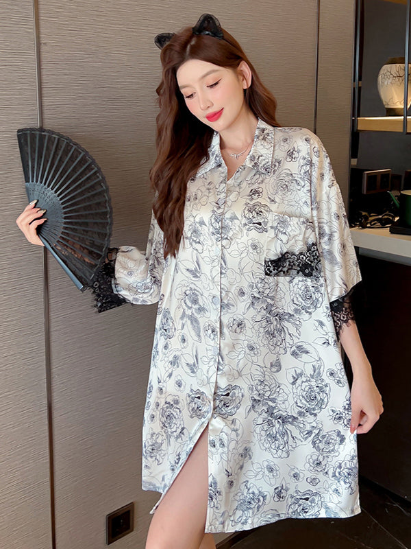 Ice Silk Shirt Dress Summer Thin Cardigan Lapel Print Short Sleeve Mid-Sleeve Nightdress