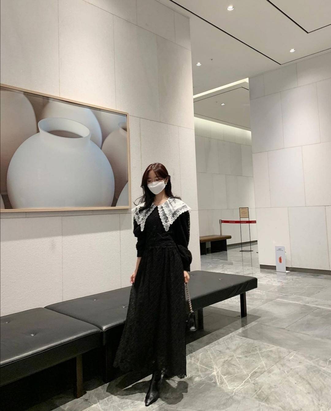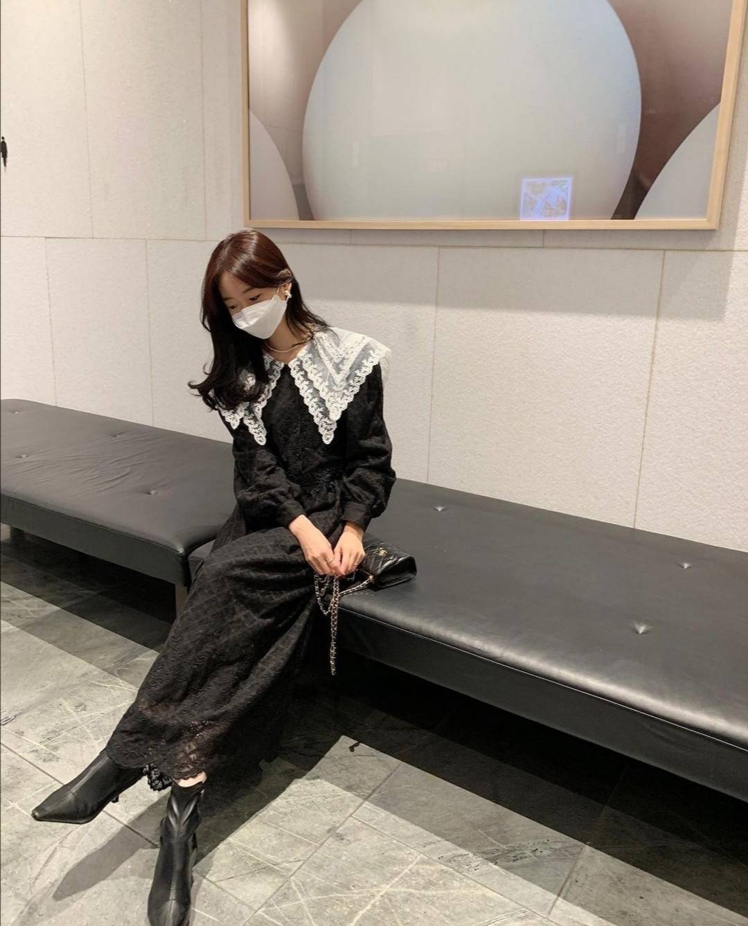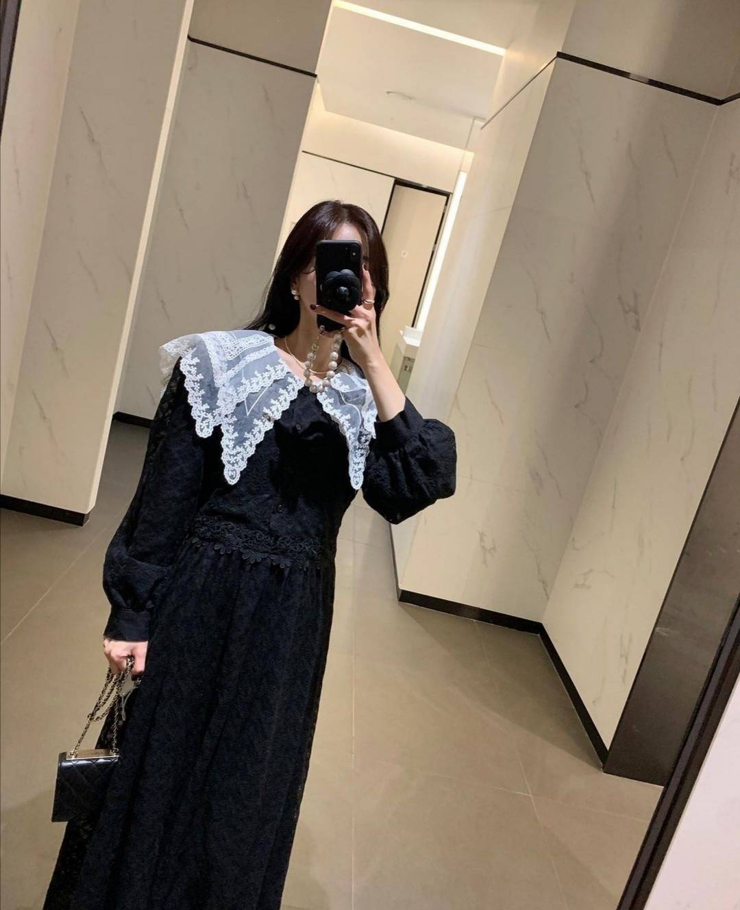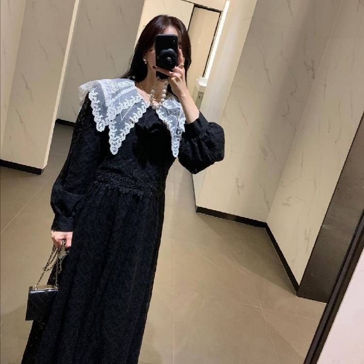 Korean Chic Hepburn Style French Style Temperament Vintage Lace Crochet Embellished Large Lapel Slimming Elegant Dress for Women