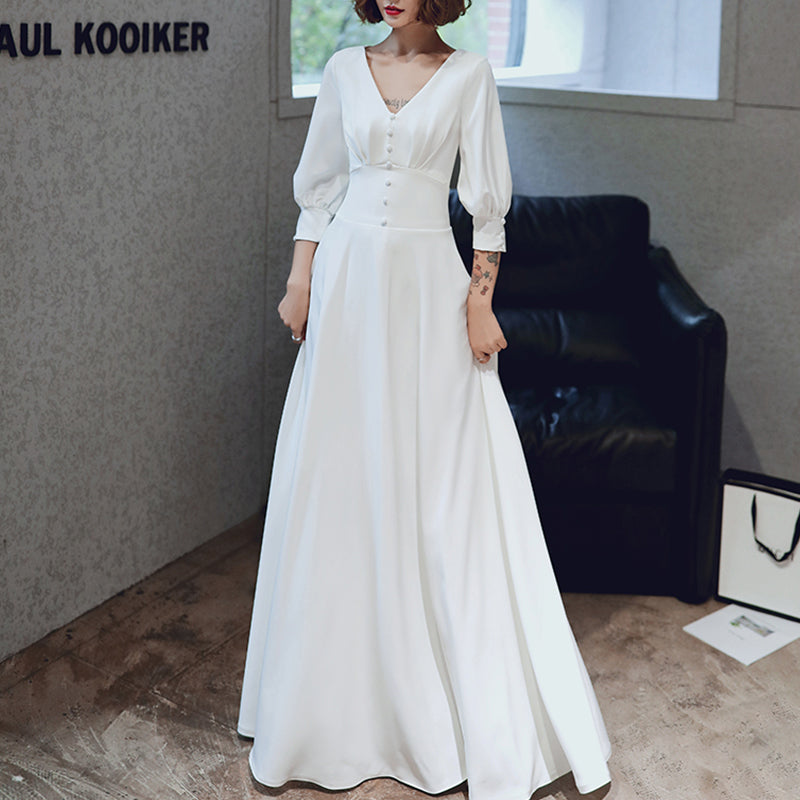 Ladies V-Neck Long Mid-Sleeve Simple Banquet Evening Dress LX095