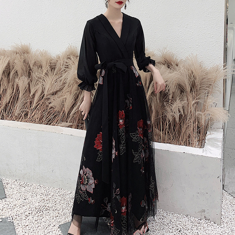 Ladies V-neck Long Three-quarter Sleeve Printed Banquet Dress LX029