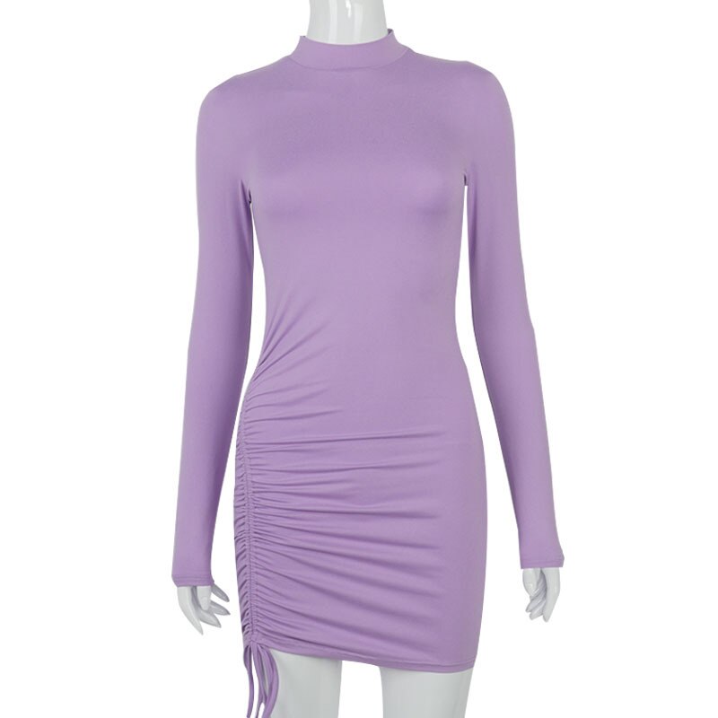 Long Sleeve Ruched Bodycon Dress Women Turtleneck Bandage Mini Dresses Autumn Black Skinny Stretchy Party Vestidos