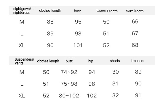 | Product Size | Bust/Chest(cm) | Length(cm) | Sleeve(cm) | Pants length(cm) | Skirt length(cm) | Hip(cm) |