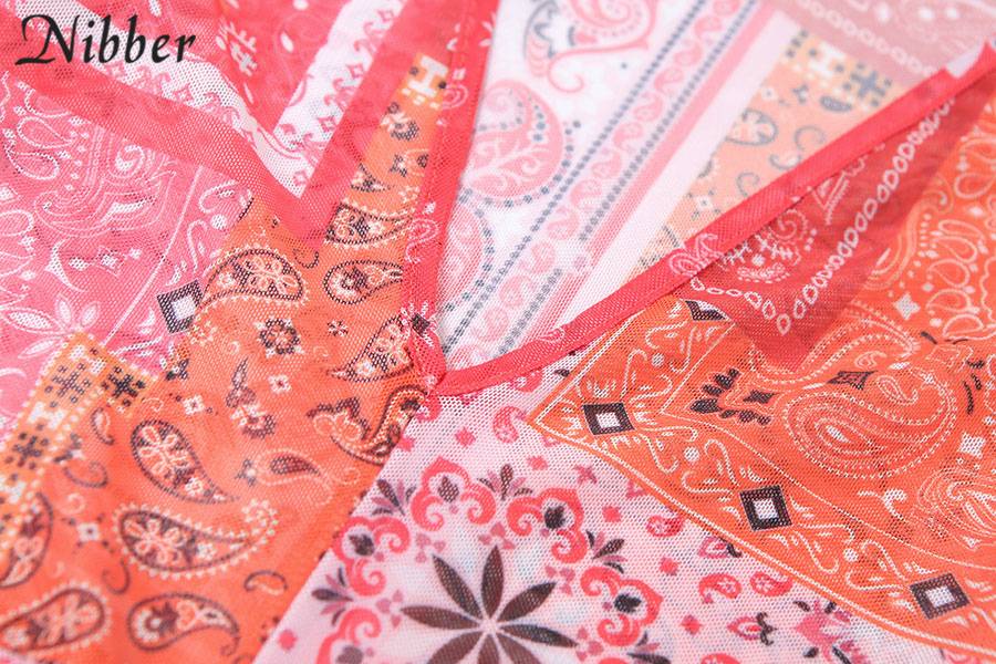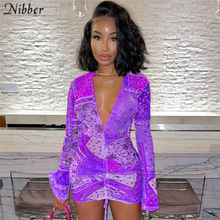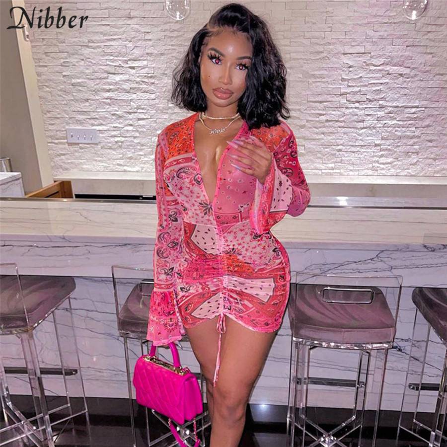 NIBBER Summer Retro Print Neon Dress Women's V neck Long Sleeve Fashion Clothing Casual Party Bodycon Mini Dress 2021 New