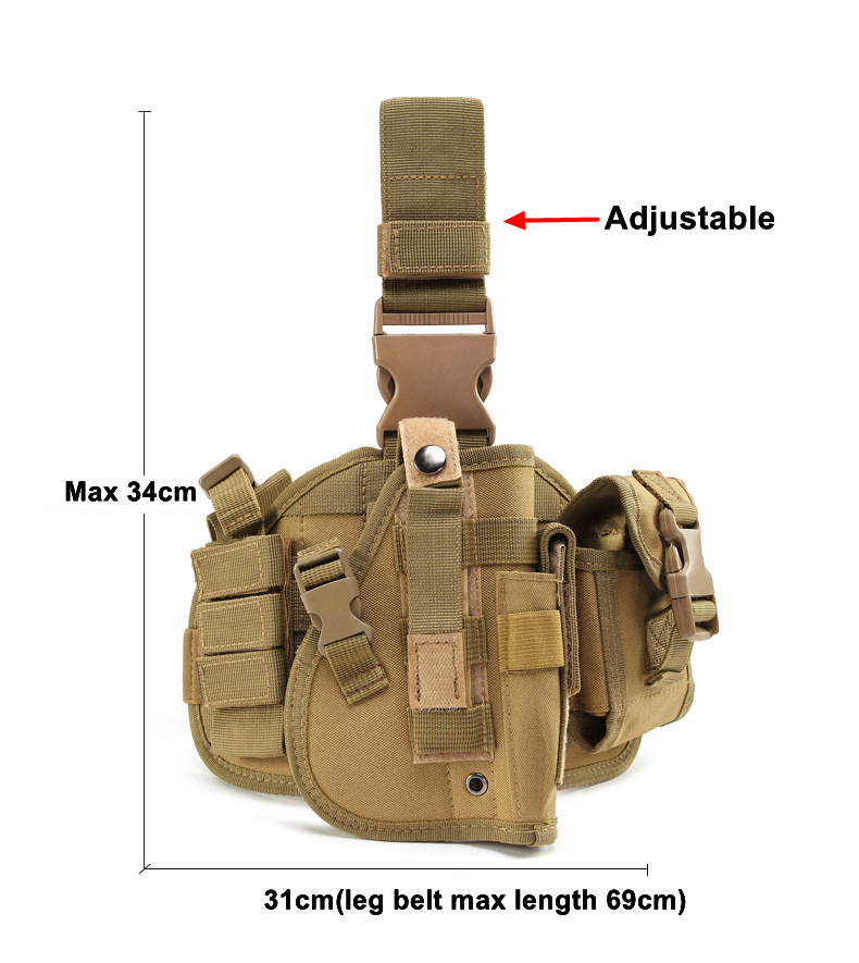 Place of Origin: CN (Country of Origin) Article: Nylon Model: Tactical Leg Sleeve Hand Option: Right Hand Carrying Platform: Platform Leg Drop Model: Tactical Holster Material: 900D Oxford Cloth Usage: Military Gun Carrying Fit: Full Size Gun For: Hunting Fit 1 : Tactical holster, leg holster