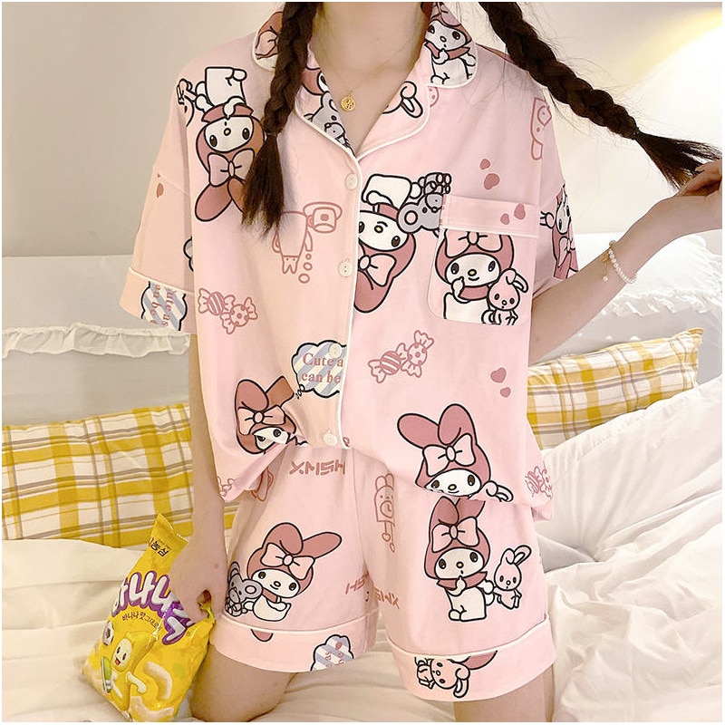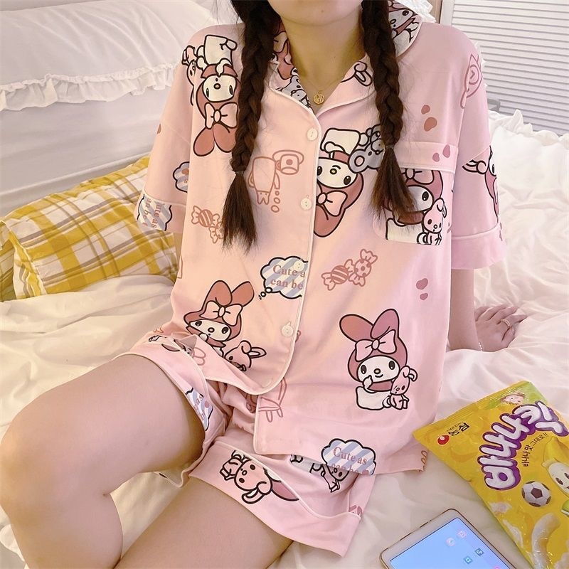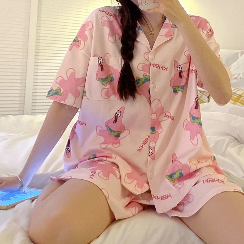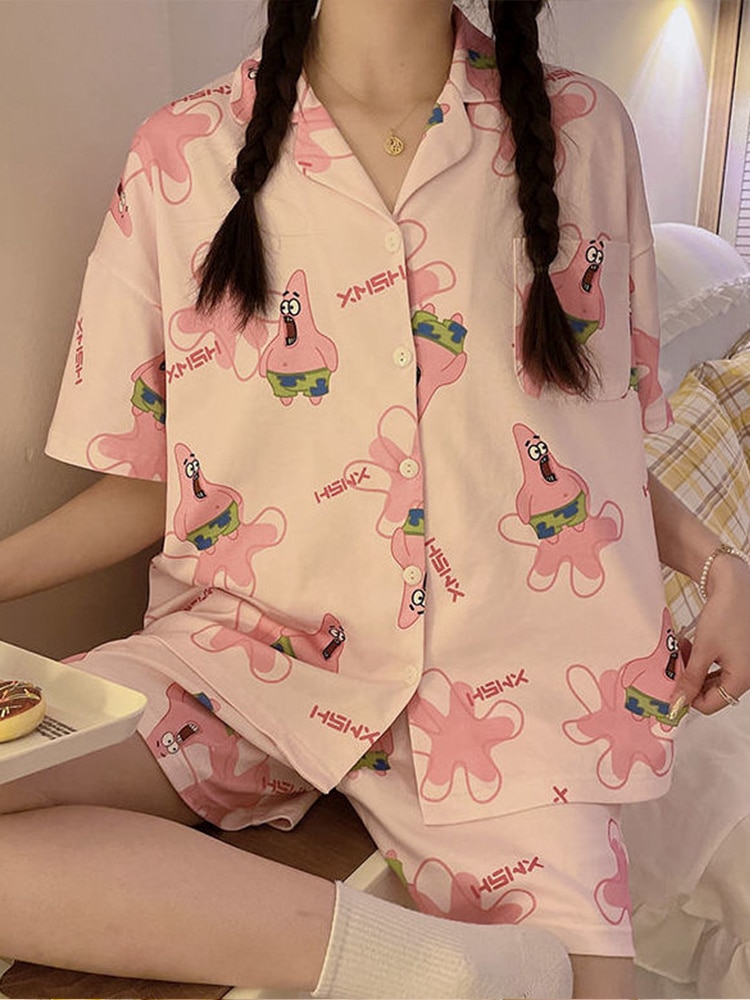 Pajama Sets SummerTurn-down Collar Short Sleeve Women Summer Cartoon Character Printed Thin Trendy Womens 2pcs Pyjamas nightgown