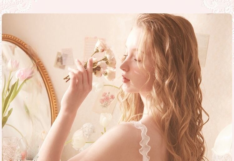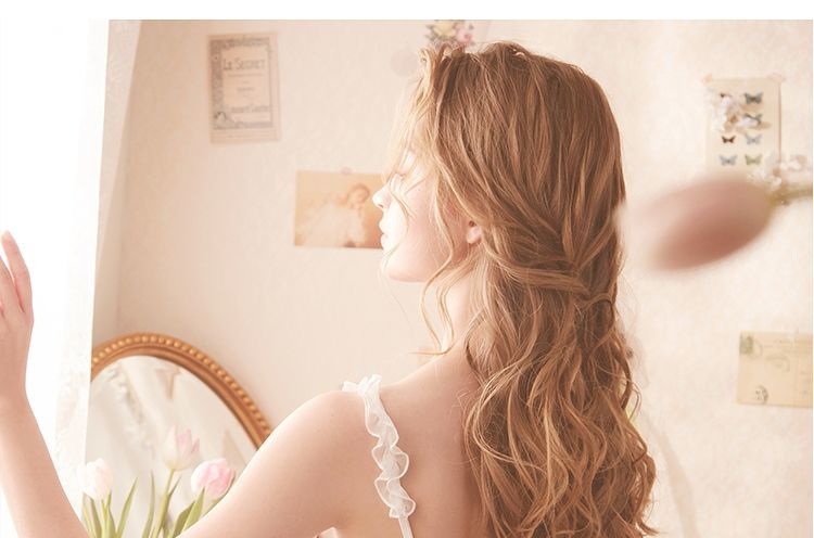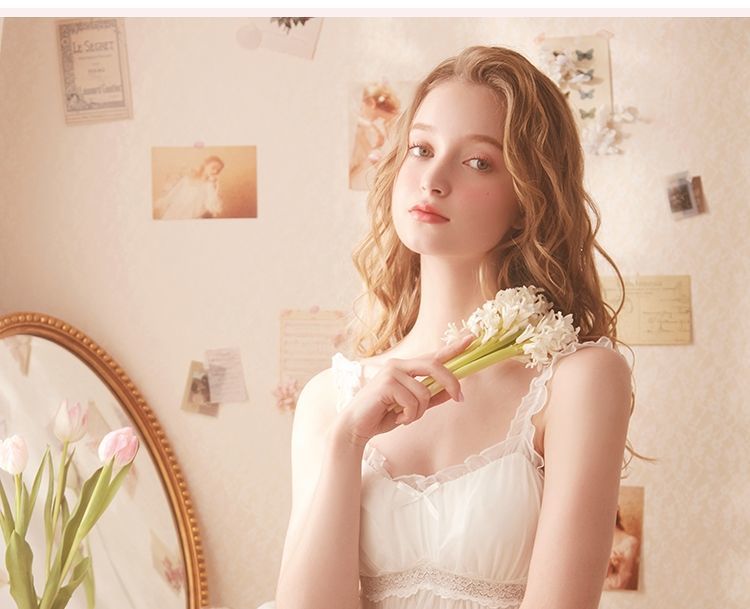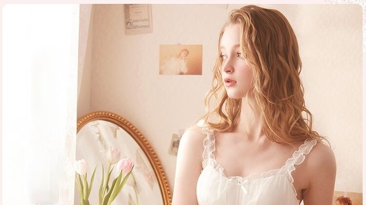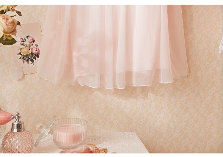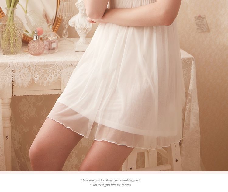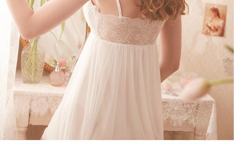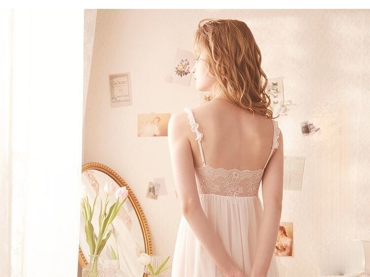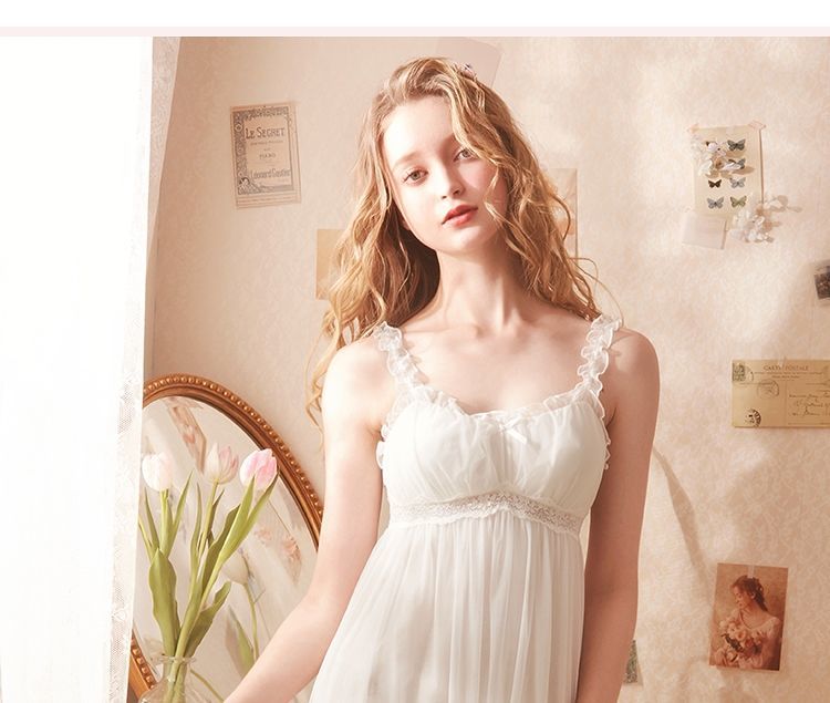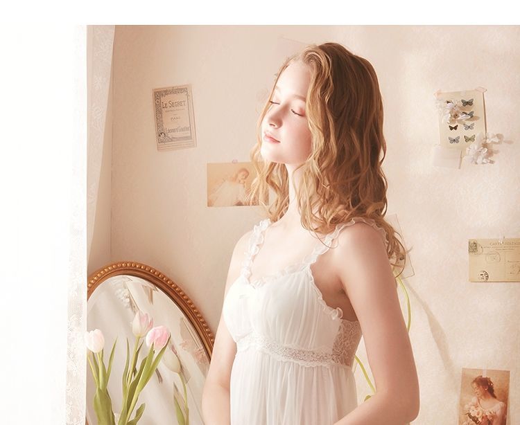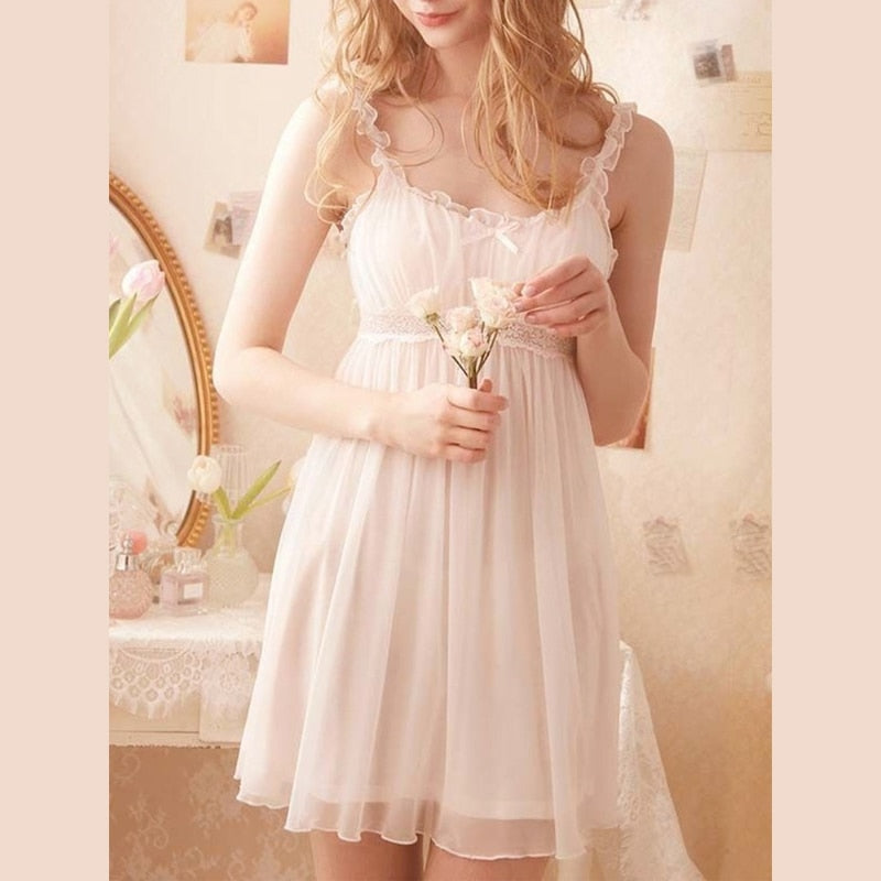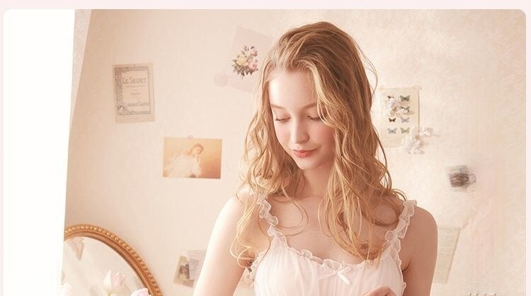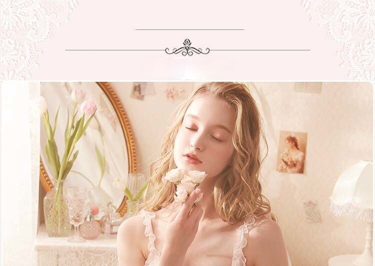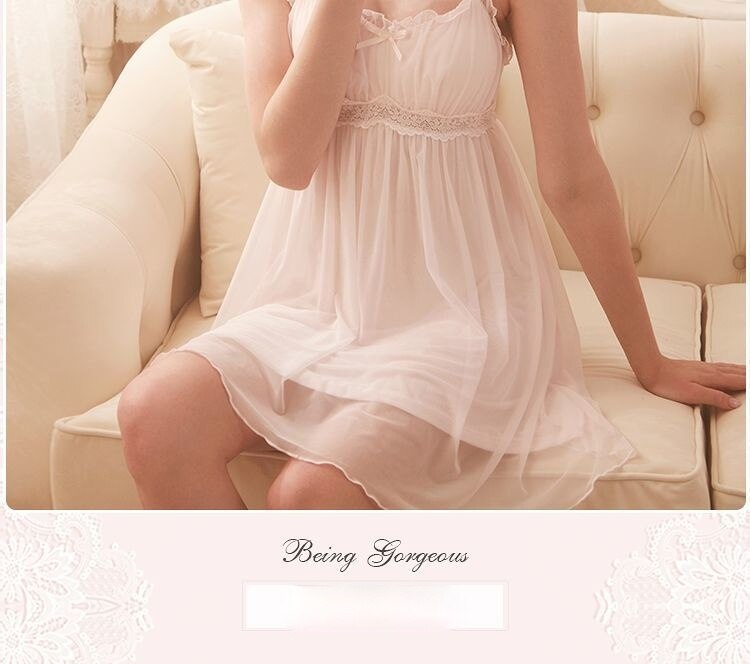 QWEEK Lace Mesh Kawaii Sleepwear Nightdress Women Sexy Nightwear Cute Nightie Fancy Nightgown Dress Dressing Gown
