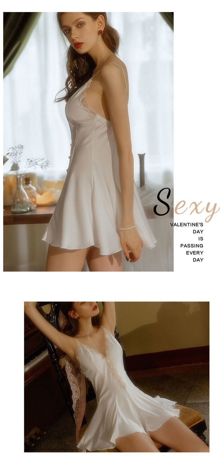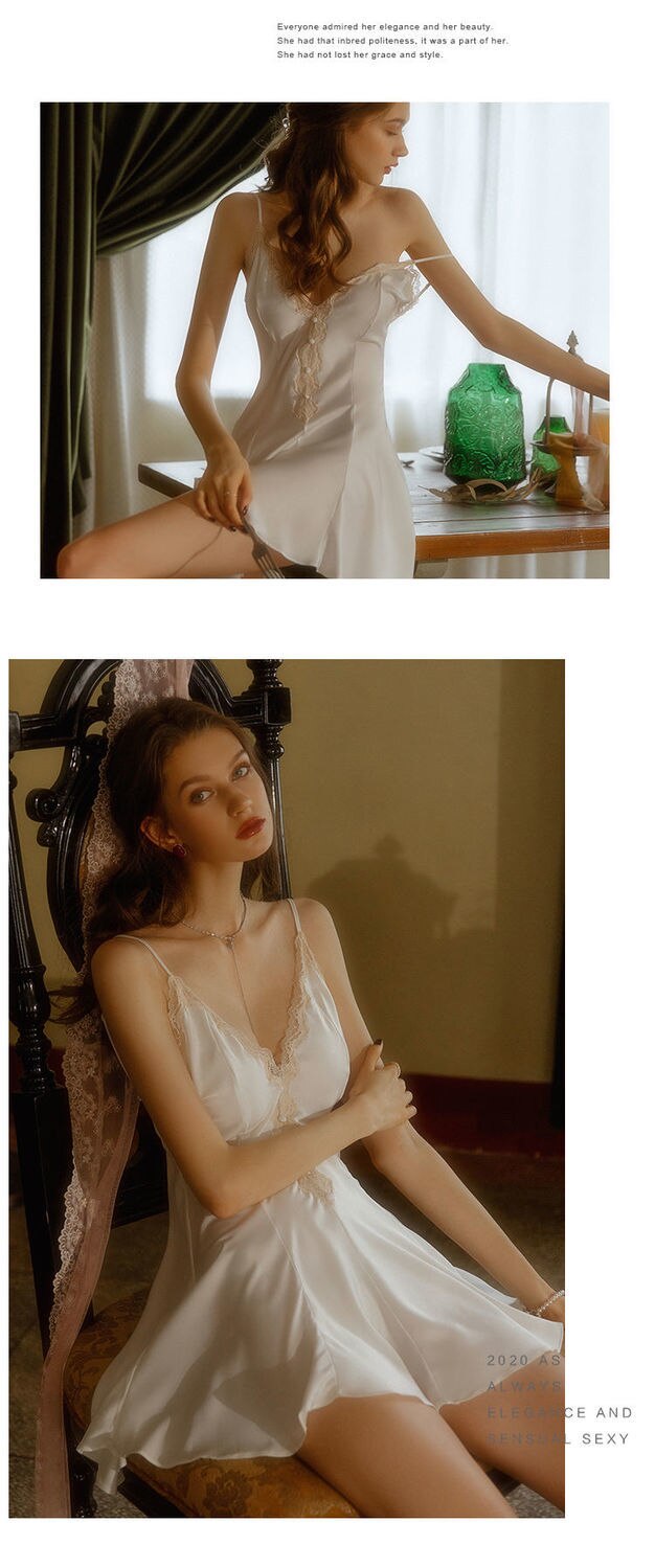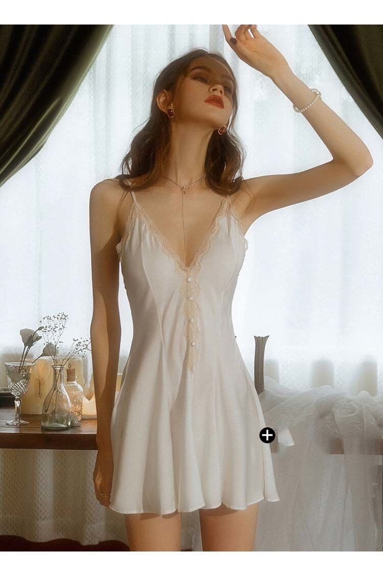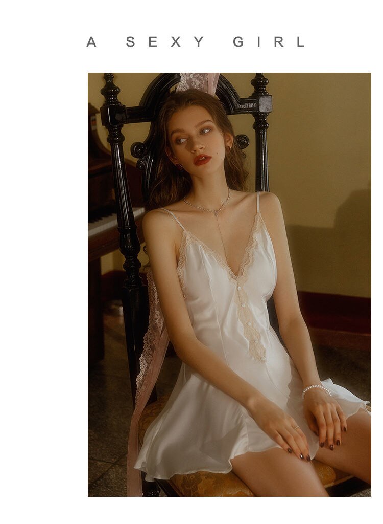 QWEEK Silk Nightgown Women Satin Sexy Sleepwear White Dresses Ladies Lace Nightwear French Elegant Homewear Mini Skirts