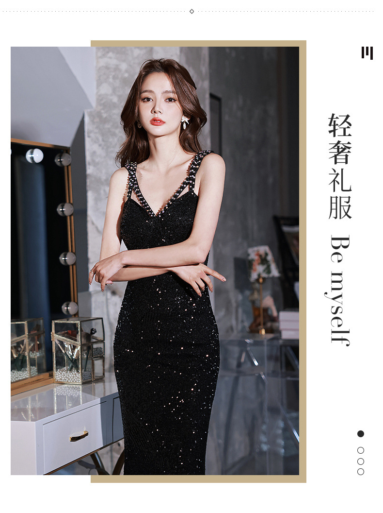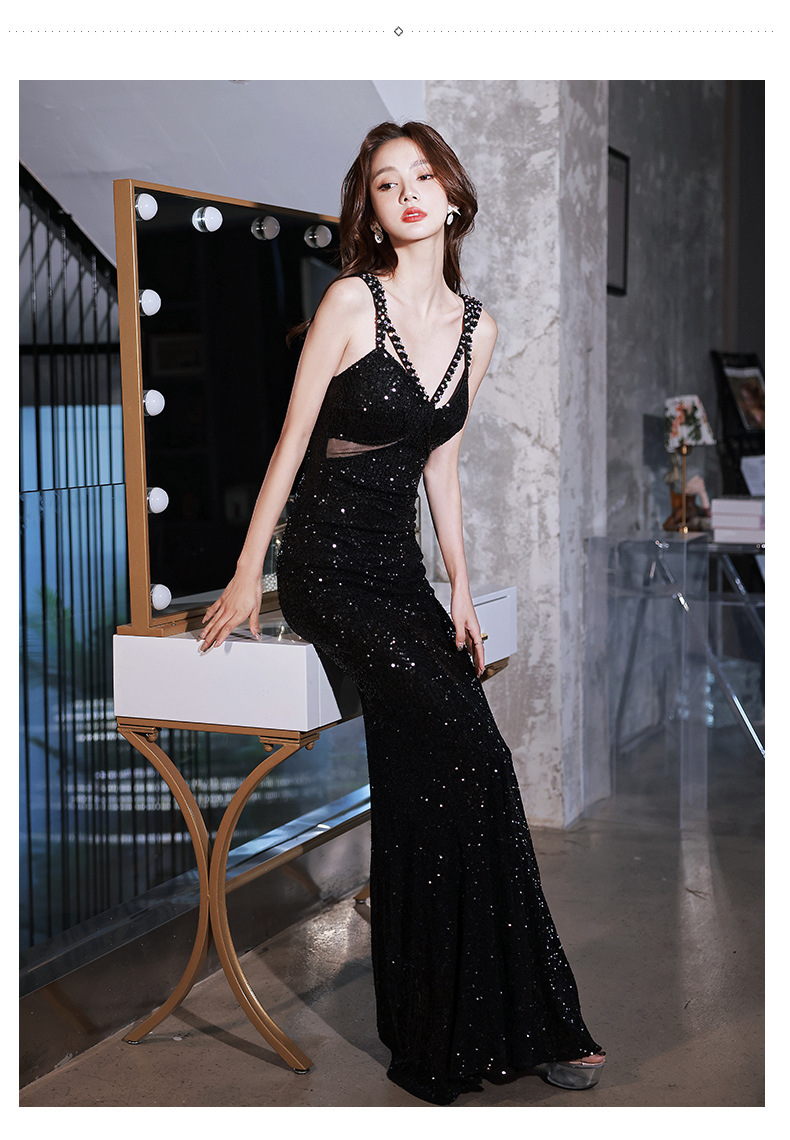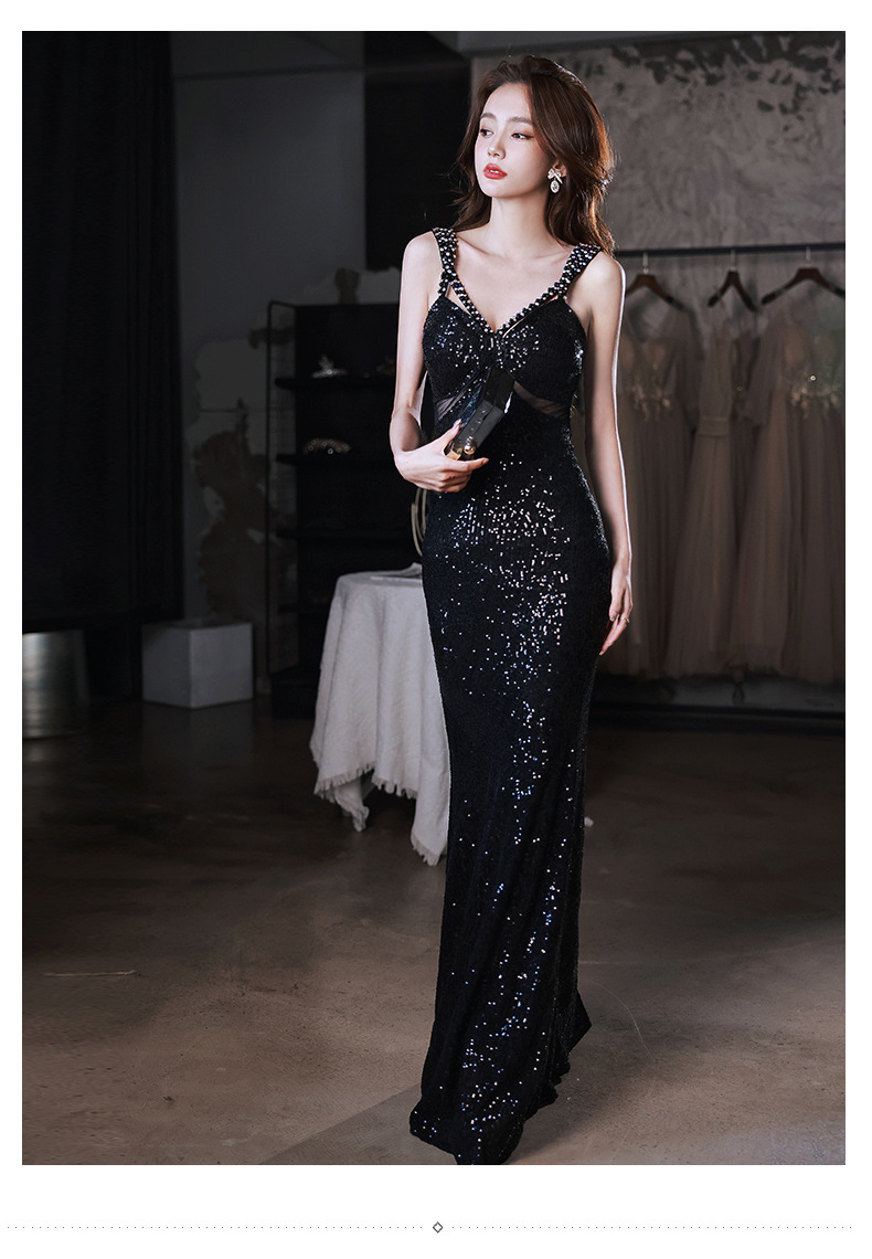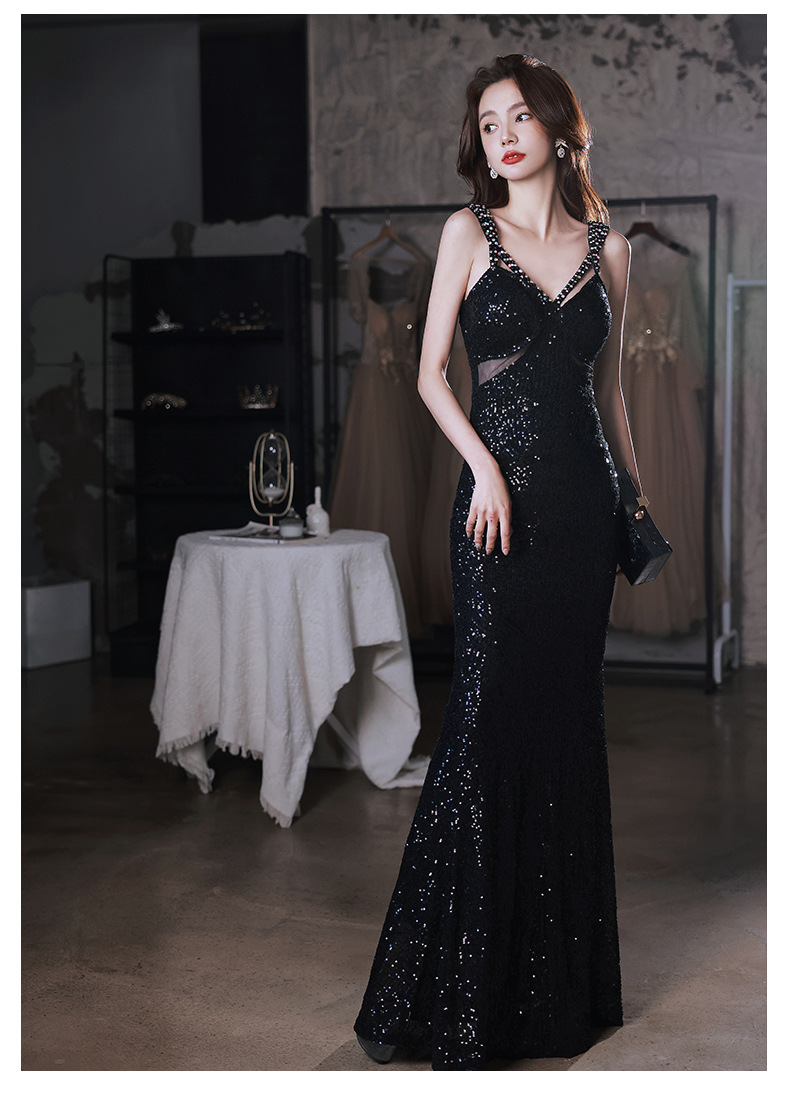 Sexy evening dress sequins black suspenders design sense fishtail temperament banquet host dignified atmosphere dress