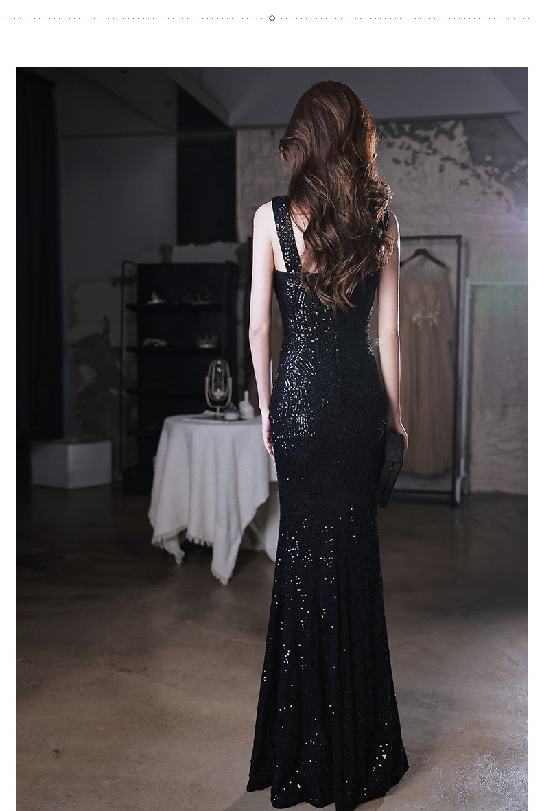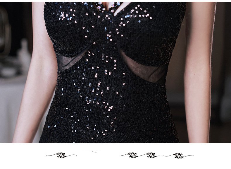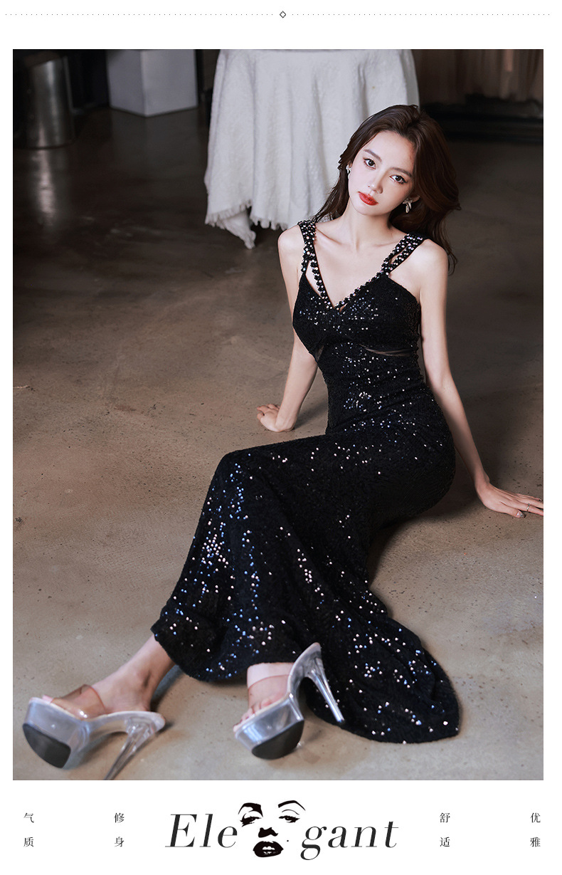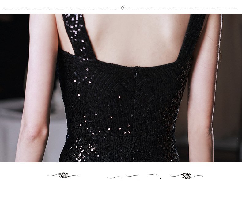 Sexy evening dress sequins black suspenders design sense fishtail temperament banquet host dignified atmosphere dress
