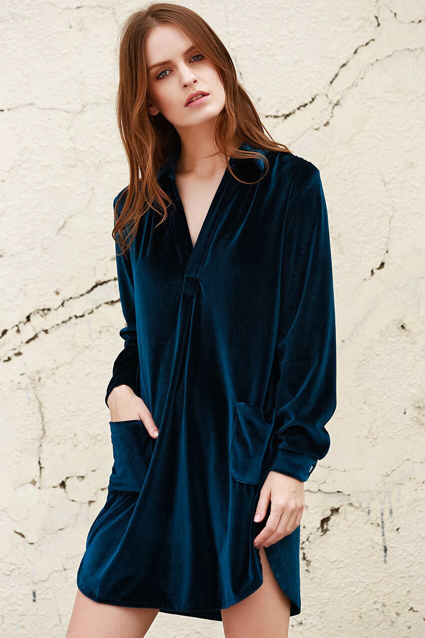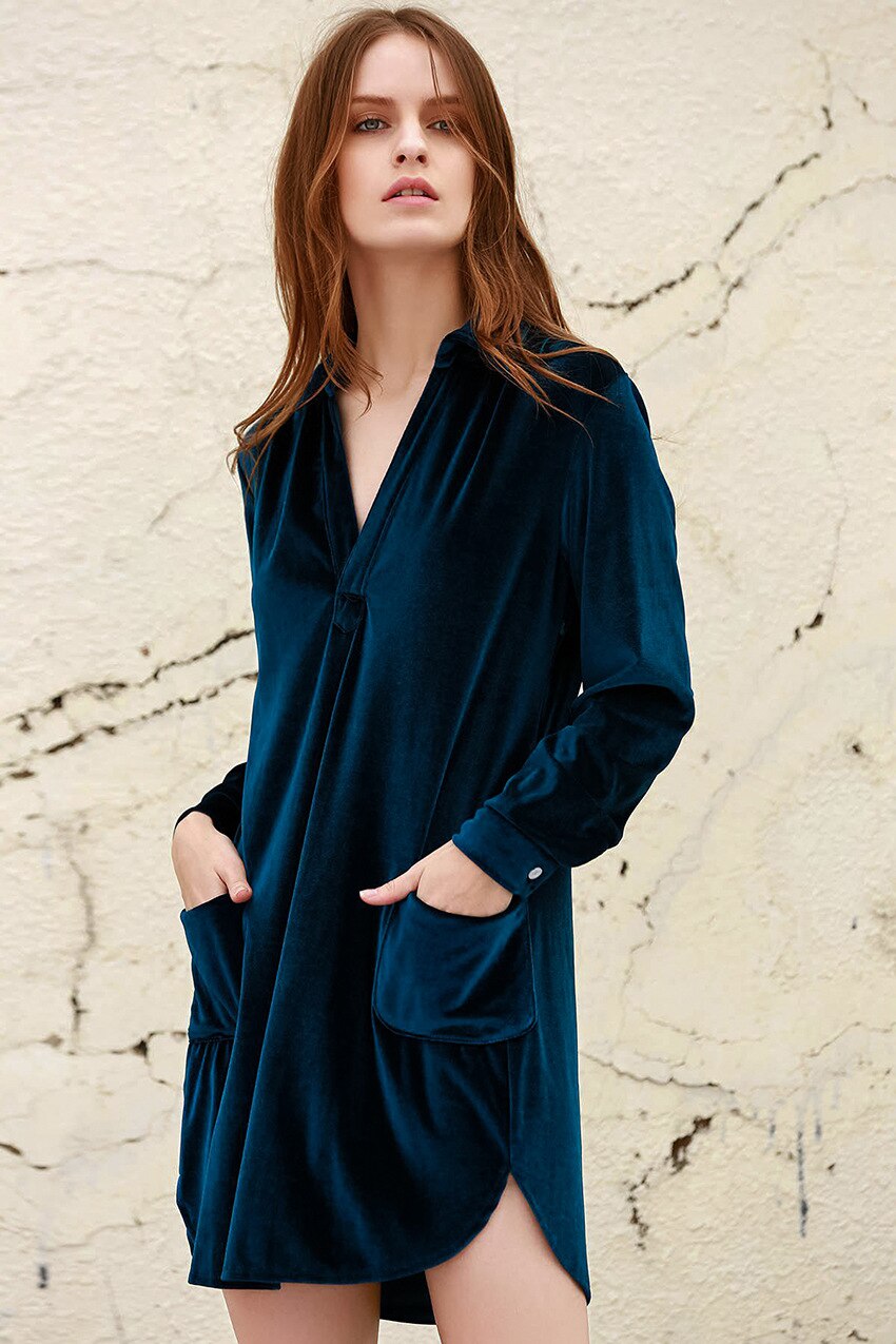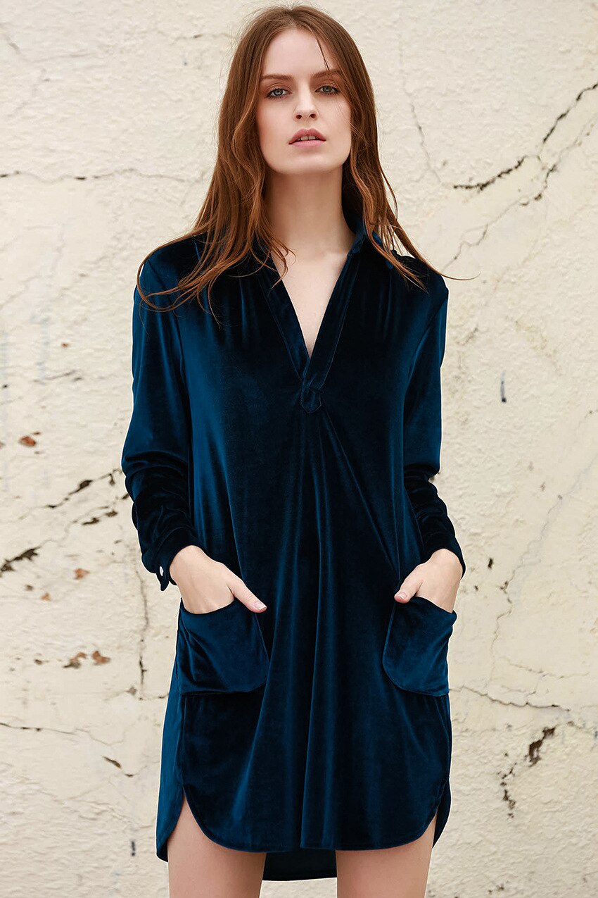 Solid Velvet Nightgown Women Sleepwear Long Sleeve Double Pockets Woman Dress Slit Loose Knitted V-Neck Night Dresses Winter