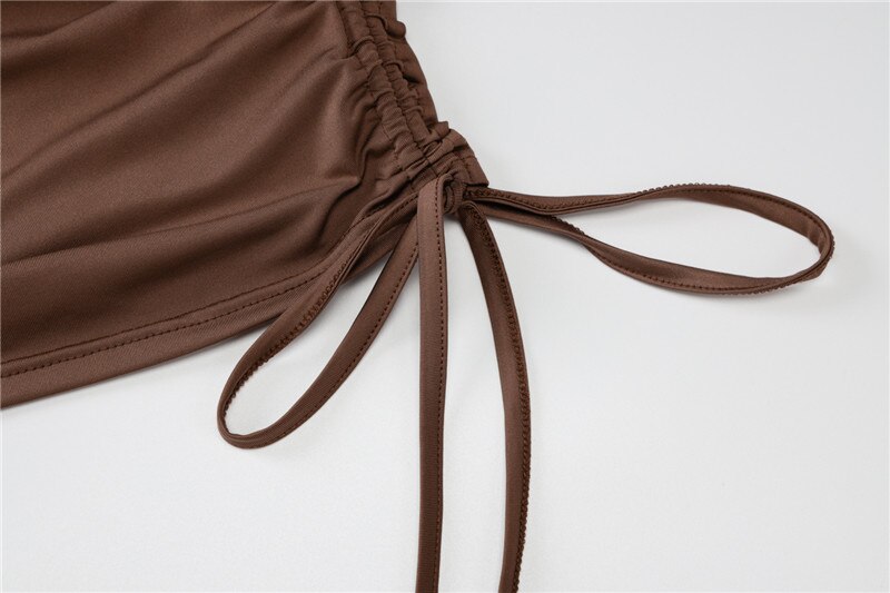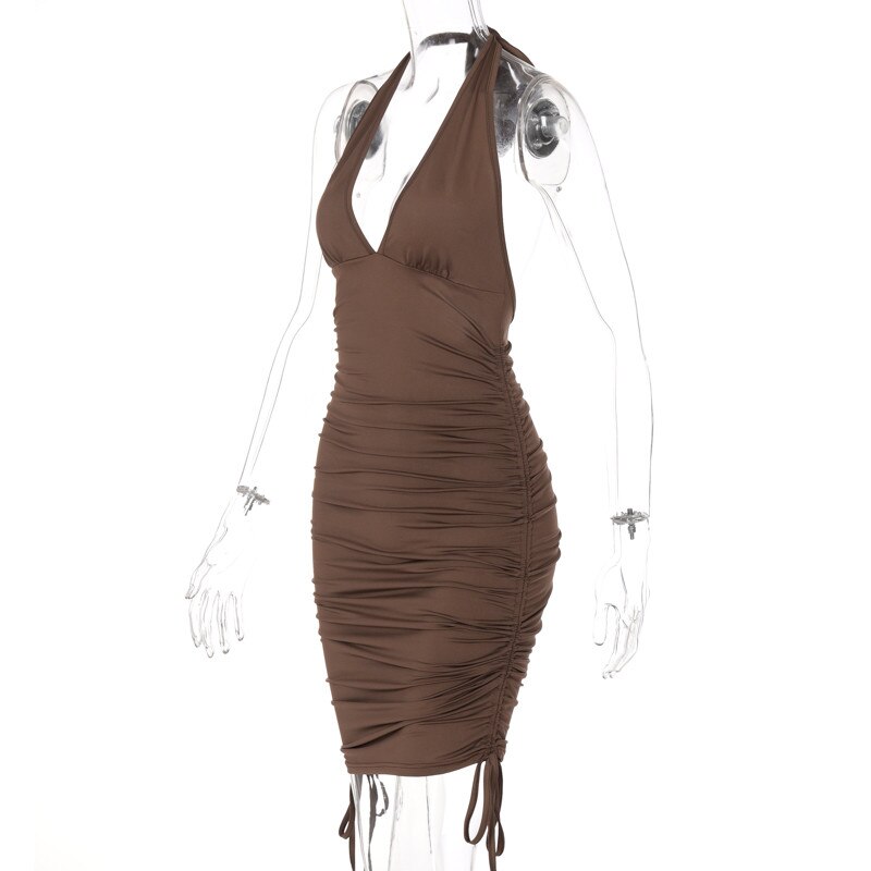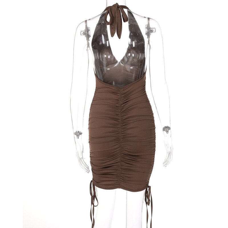 Solid Women Halter Mini Dress Drawstring Ruched V Neck Backless Bodycon Sexy Streetwear Party Club Elegant 2021 Summer