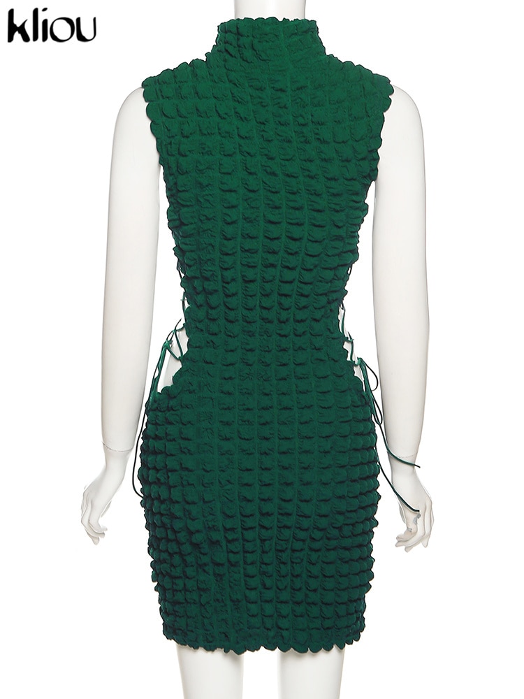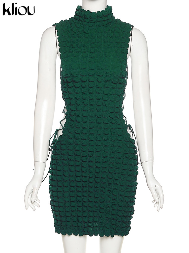 Stunning Stacked Mini Dress Women Sexy Solid Mock Neck Sleeveless Draw String Bodycon Party Clubwear Elegant Female Skirt
