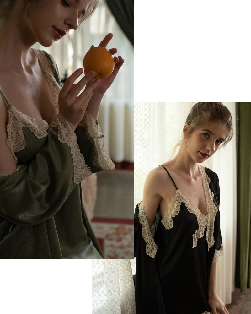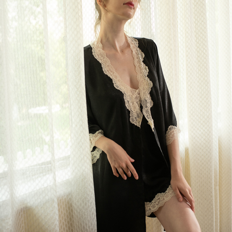Velvet lace suspenders back sexy pajamas home clothes simulation ice silk nightdress women's nightgown