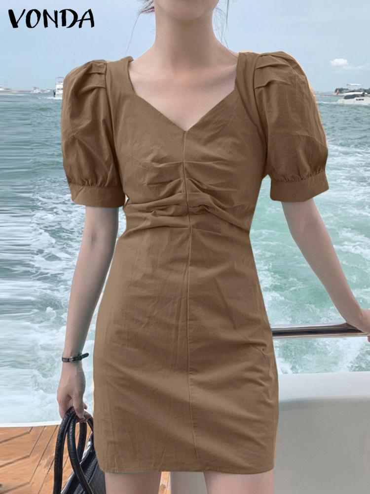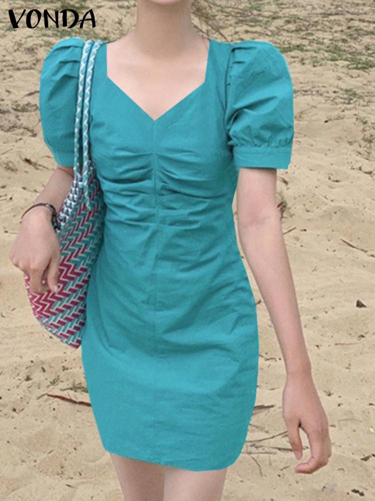 VONDA Elegant Dresses For Women 2022 Solid V Neck Short Puff Sleeve Ruched Pleated Bodycon Dress Bohemian Party Casual Summer Plus Size Short Dresses