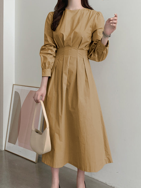 VONDA ladies Japanese and Korean casual solid color dresses, elegant and simple casual round neck pleated waist long-sleeved A-line skirt, large-size skirt, daily spring and autumn large size  trend long skirt