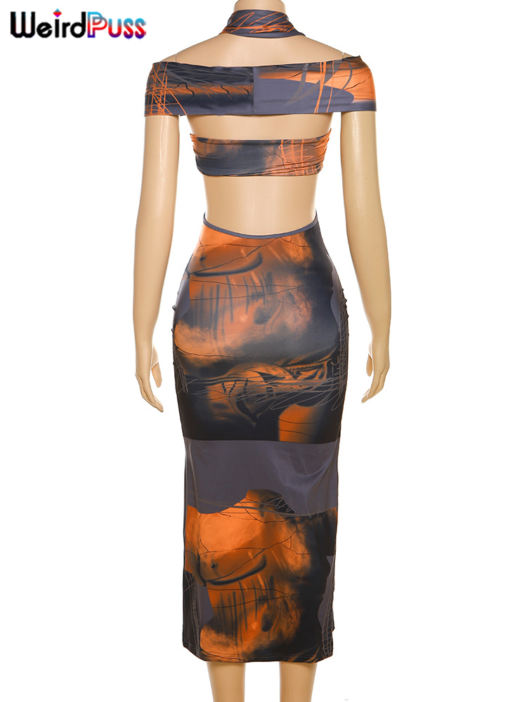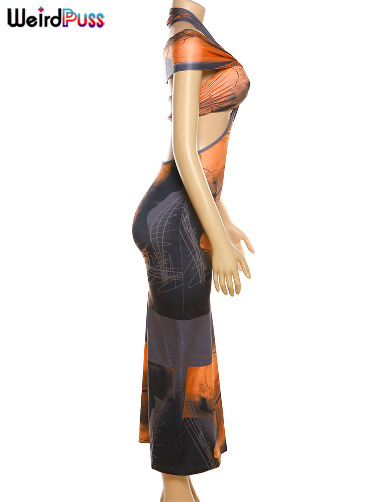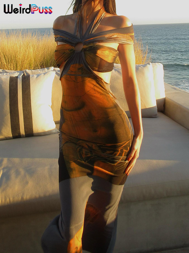 Weird Puss Colorful Print Women Maxi Dress Halter Hollow Sleeveless Slash Neck Elegant Summer Vacation Party Bodycon Vestidos