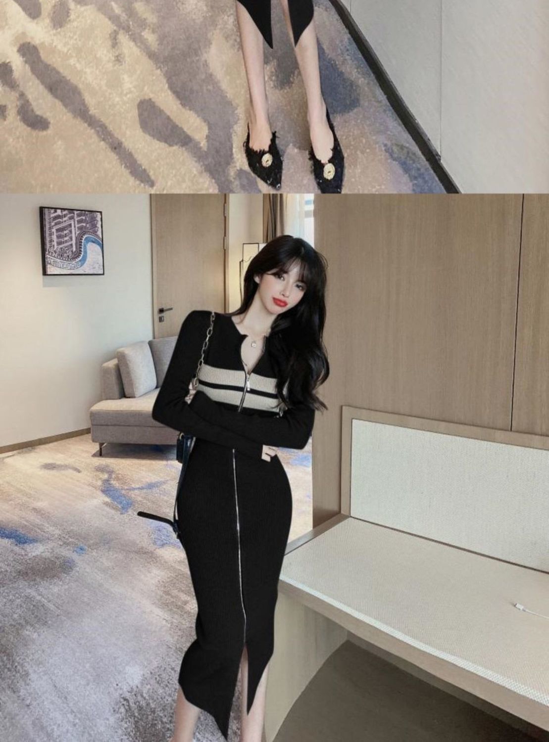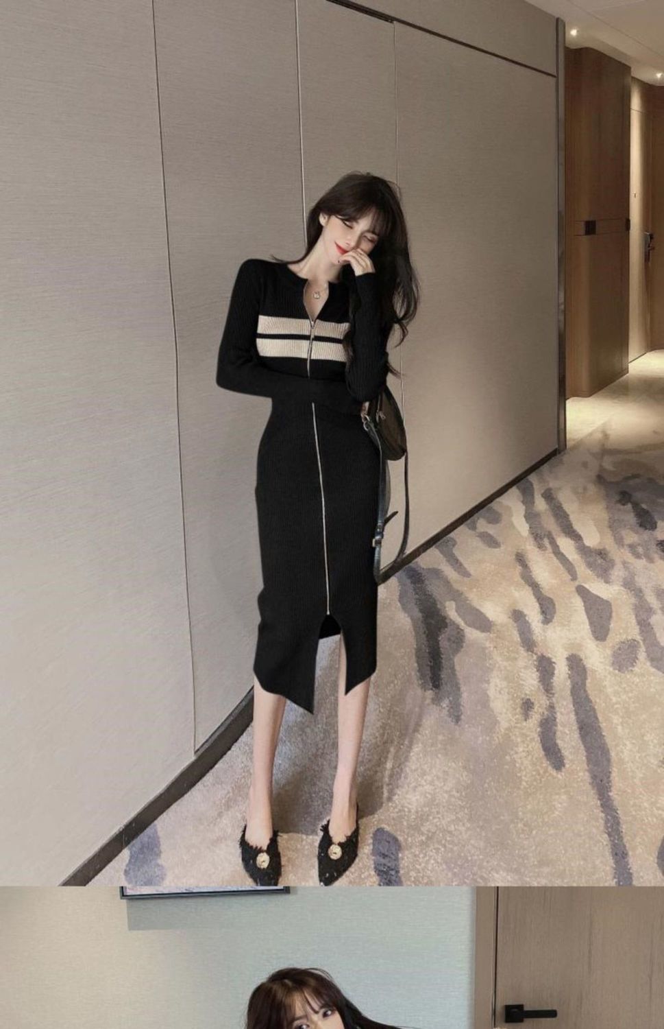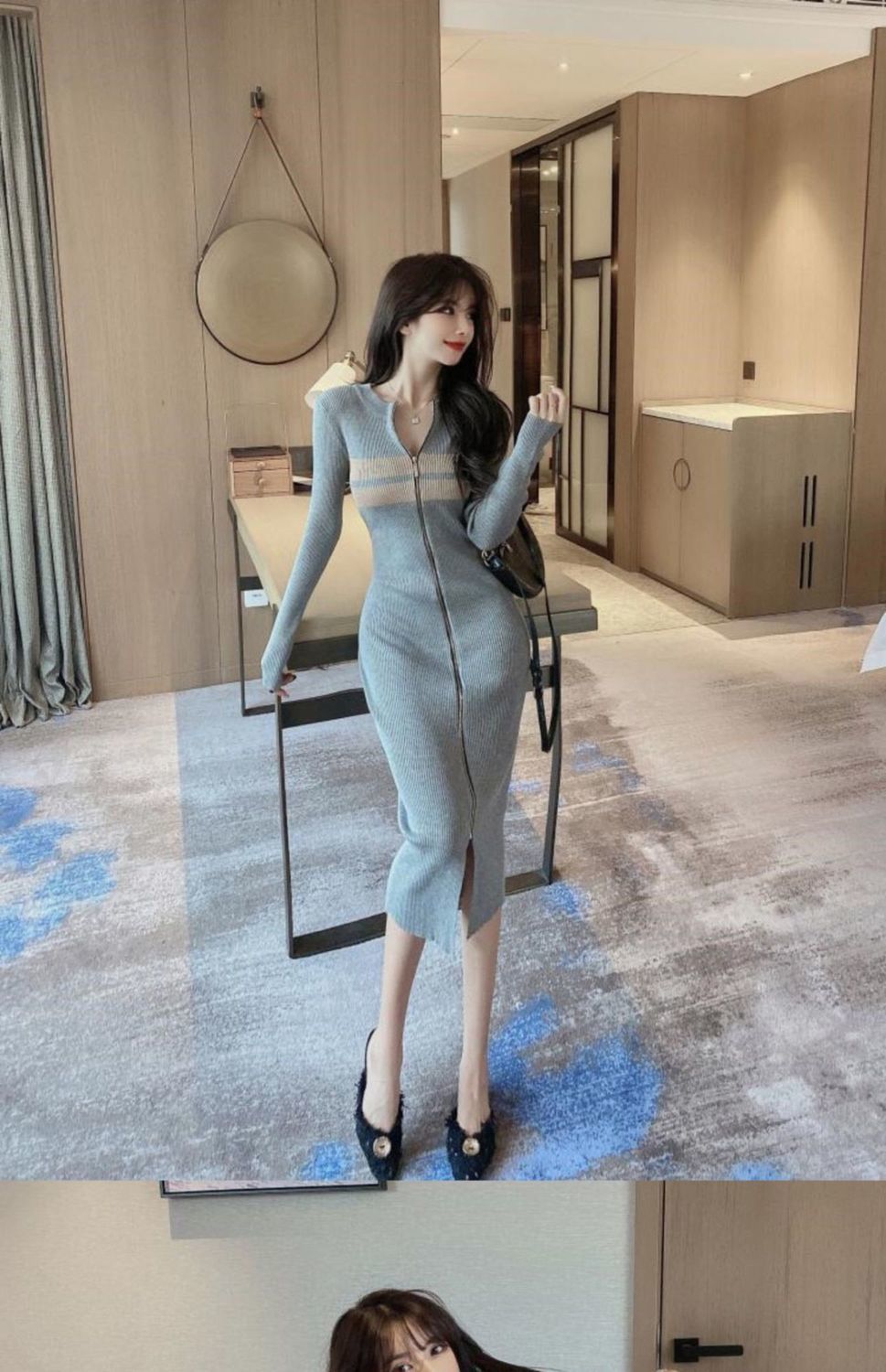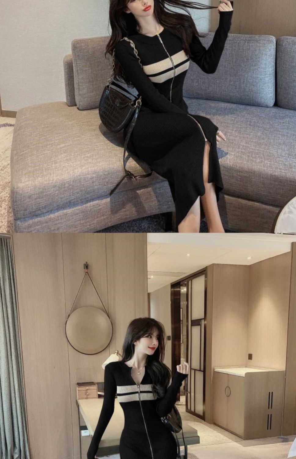 Woherb sexy long sleeve knitted dress women's slim temperament elegant elastic Y2k bodycon Vitido midi long zipper dress Korean