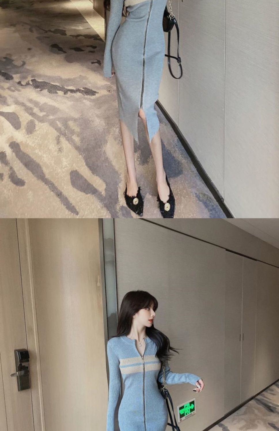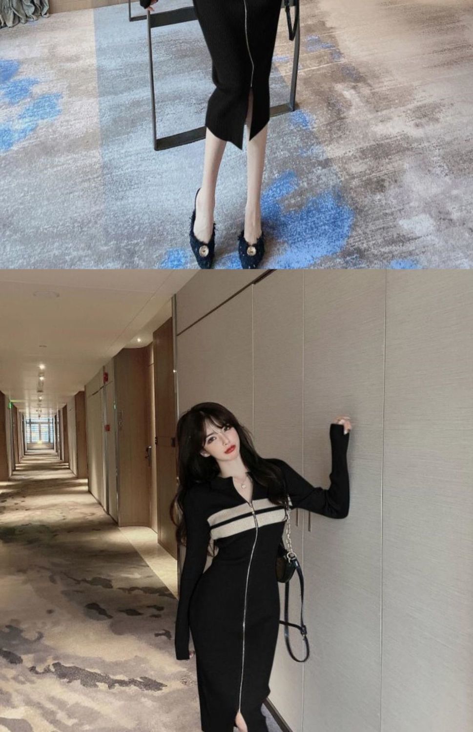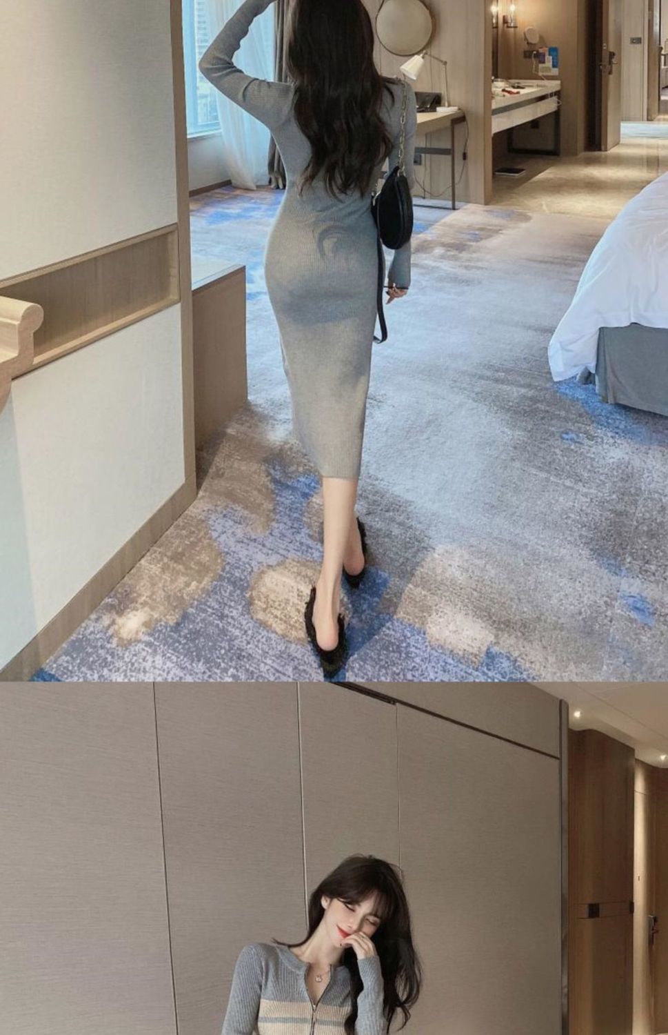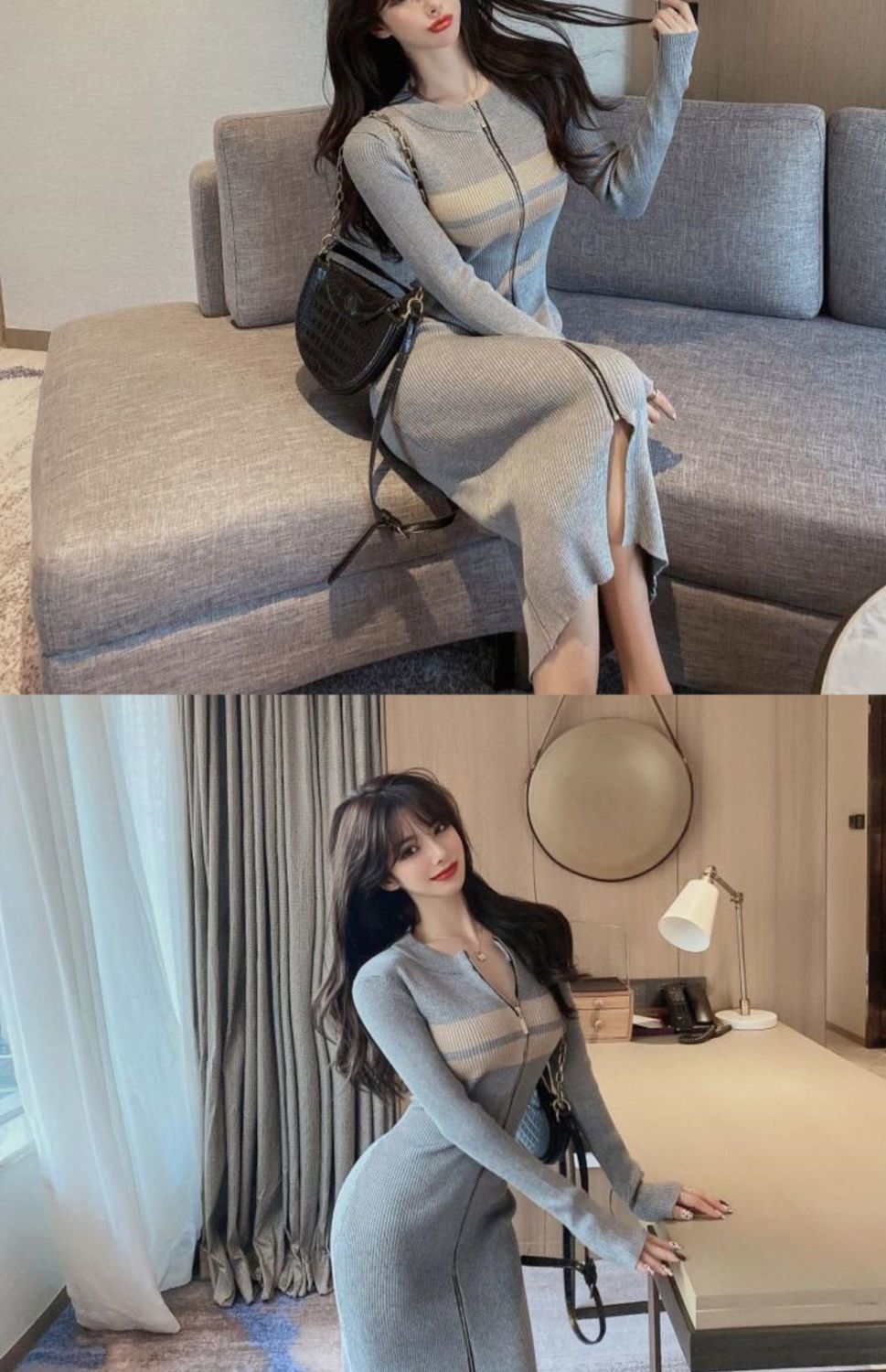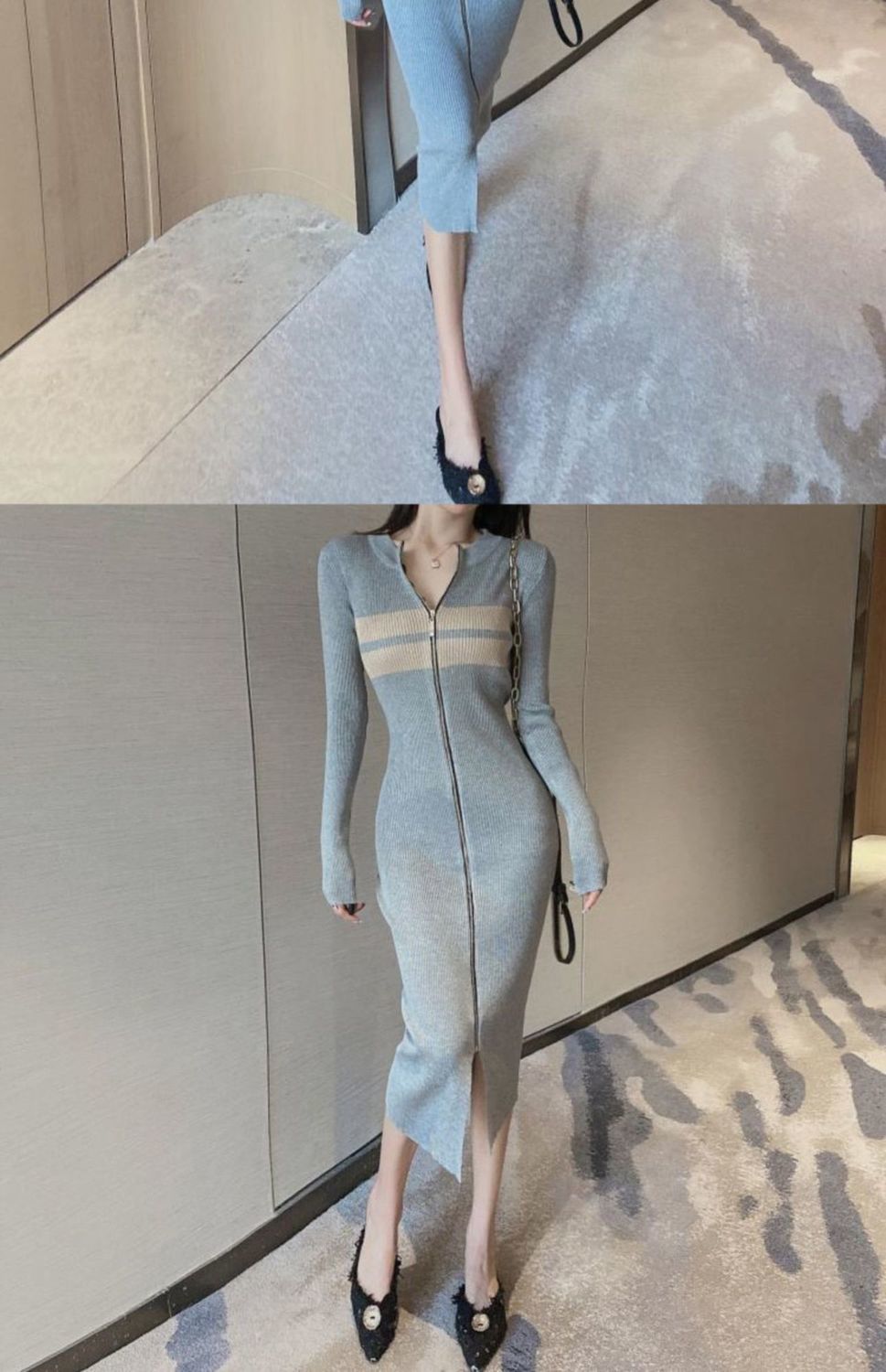 Woherb sexy long sleeve knitted dress women's slim temperament elegant elastic Y2k bodycon Vitido midi long zipper dress Korean
