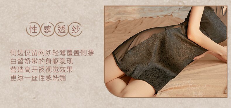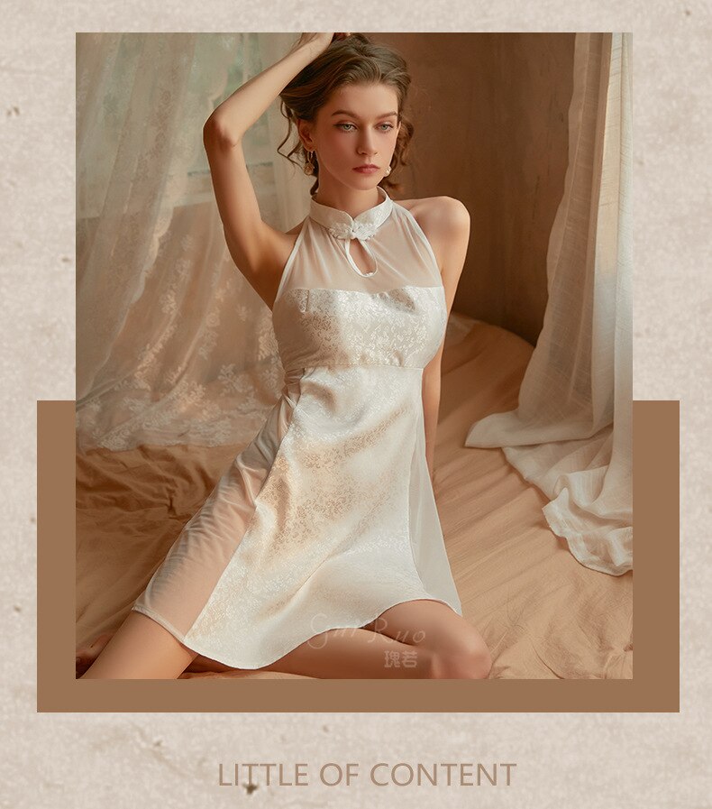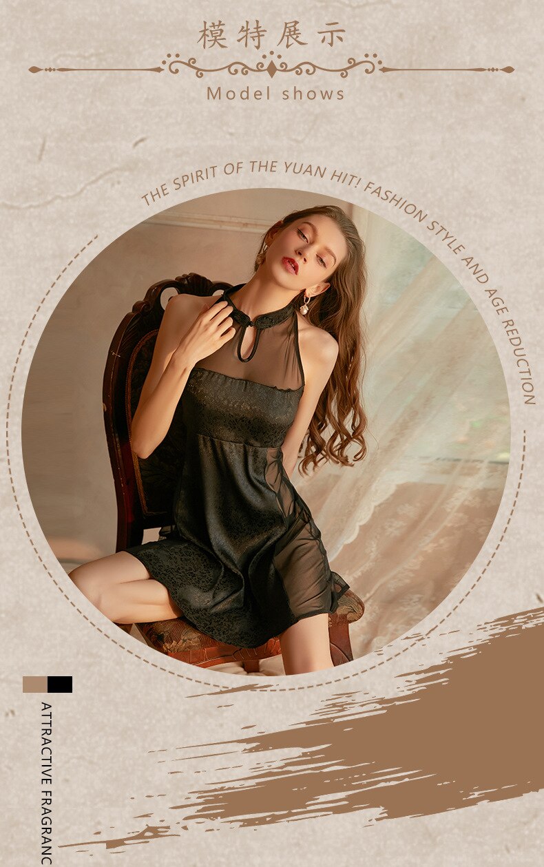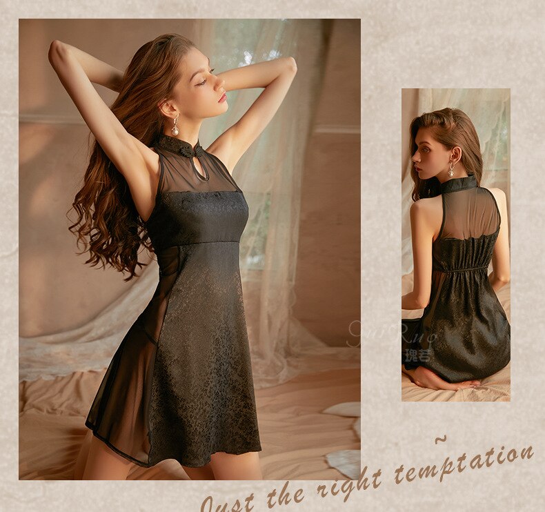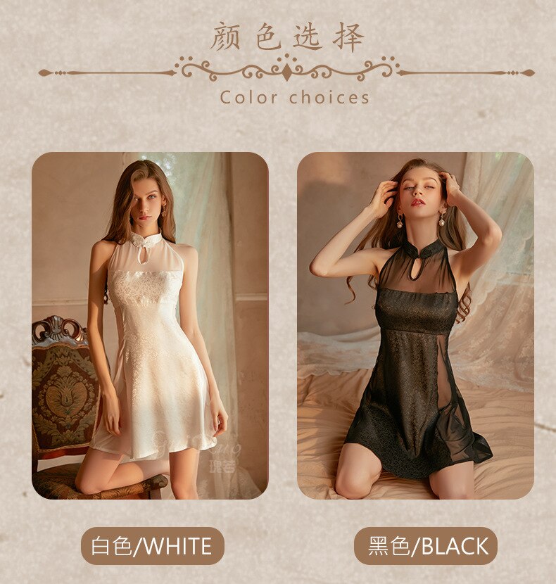 Women's Sexy Skirt Retro Chinese Cheongsam Collar Satin Mesh Perspective Sleeping Skirt Thong Set Night Dress Female Nightgown
