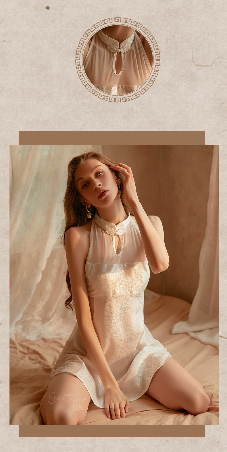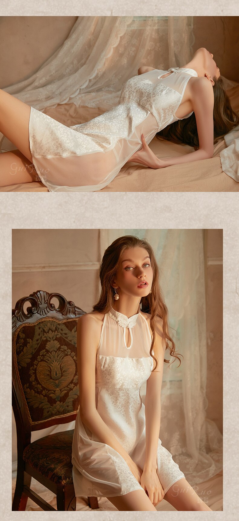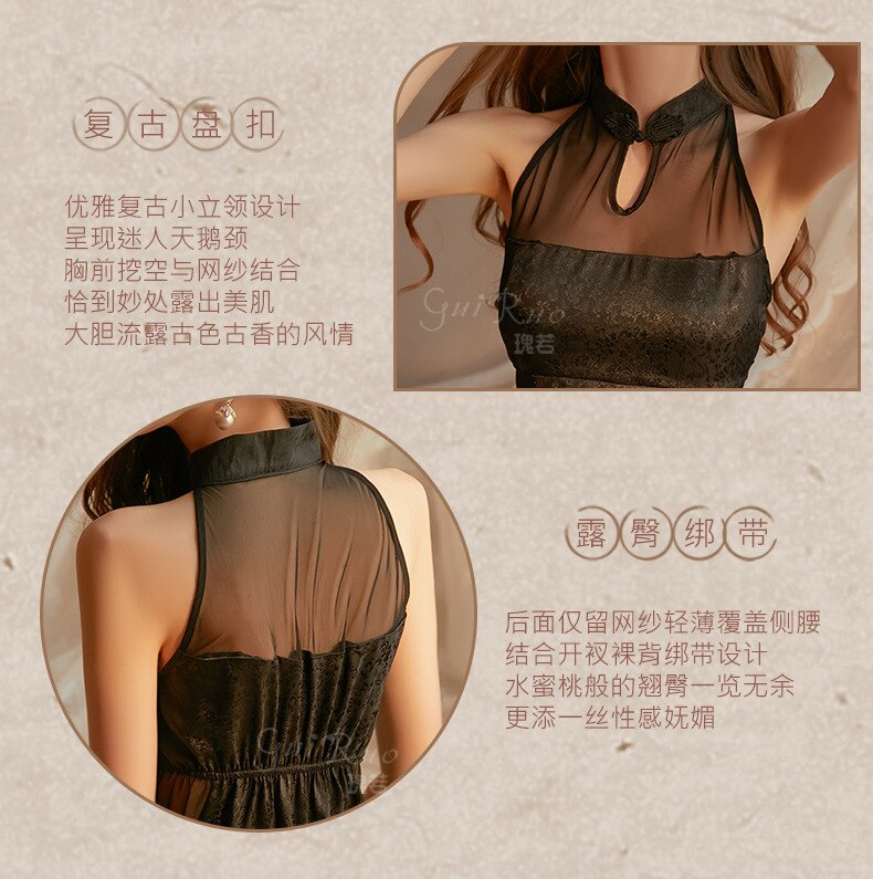 Women's Sexy Skirt Retro Chinese Cheongsam Collar Satin Mesh Perspective Sleeping Skirt Thong Set Night Dress Female Nightgown