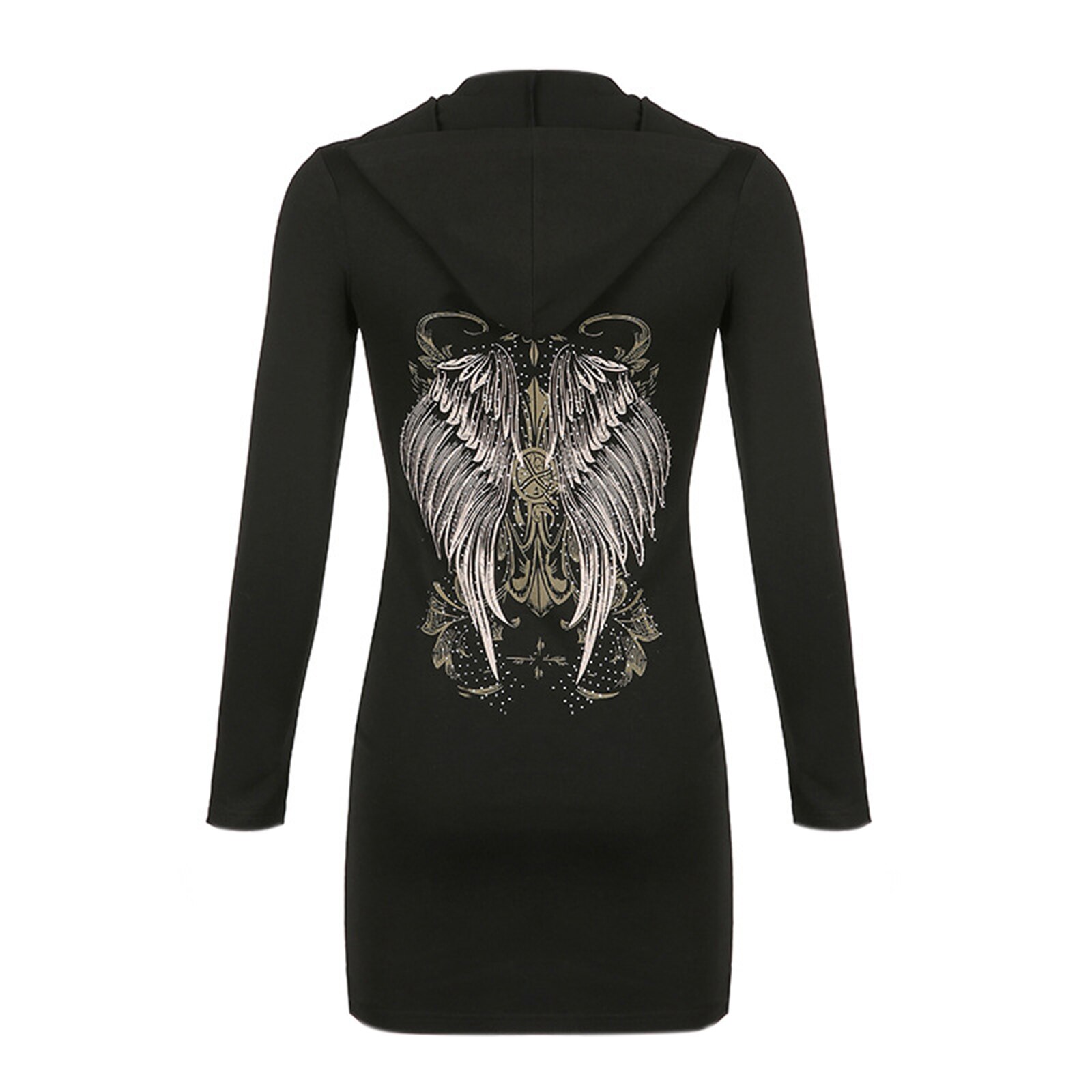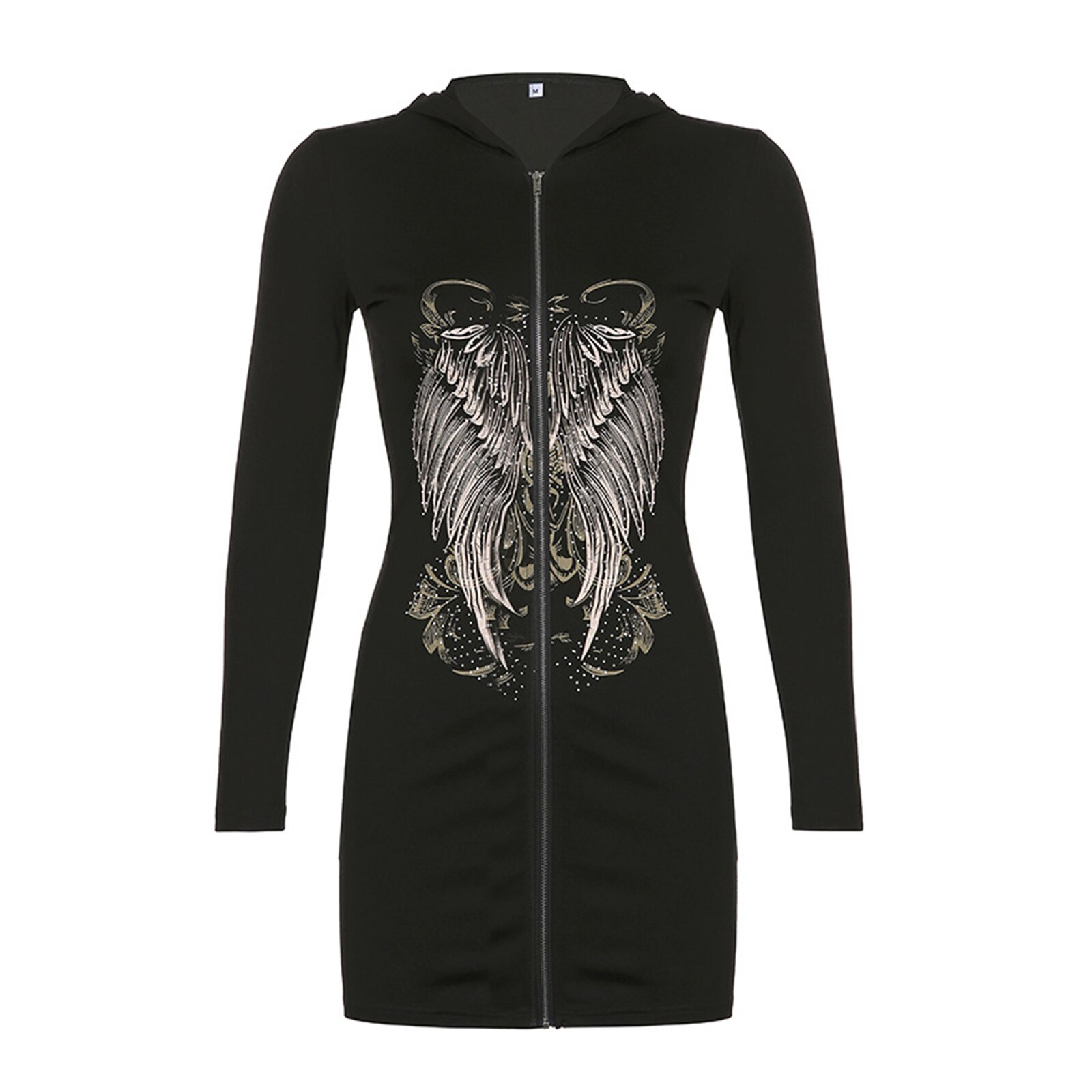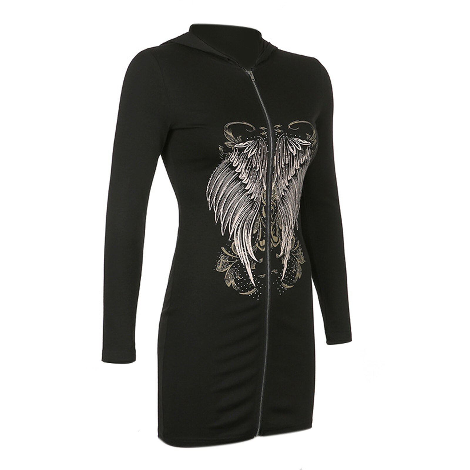 Women Hooded Dress Spring Autumn Black Dress Wings Printed Pattern Long Sleeve Zipper Bodycon Dress Gothic Clothes