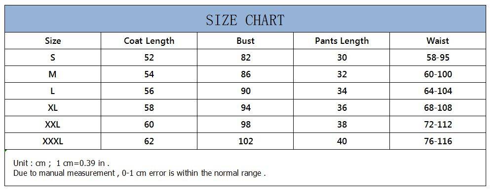 | Product Size | Bust/Chest(cm) | Length(cm) | Sleeve(cm) | Pants length(cm) | Skirt length(cm) | Waist(cm) | Hip(cm) |