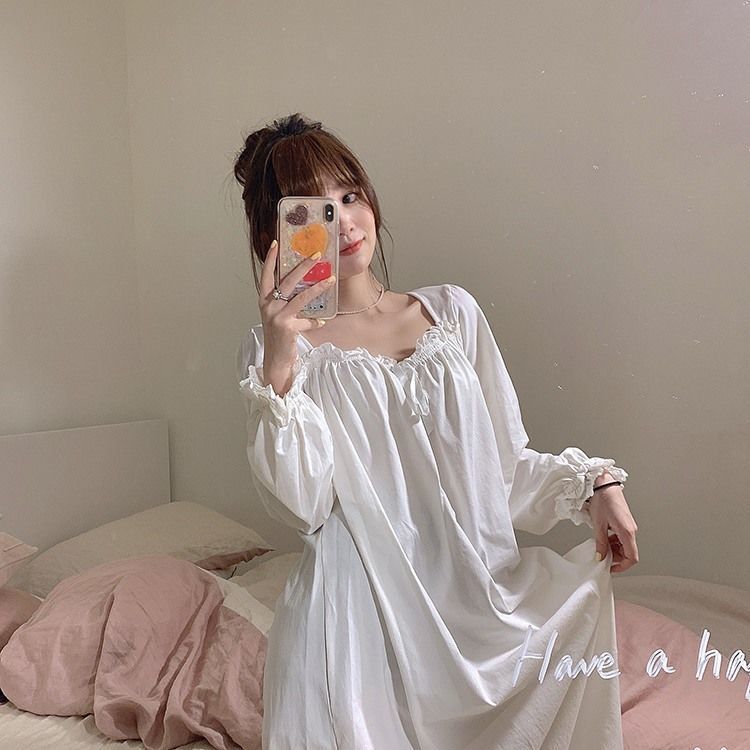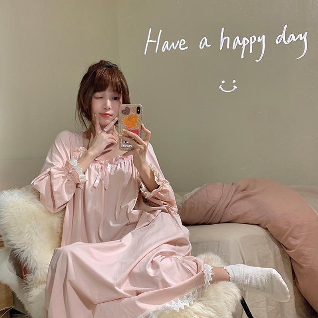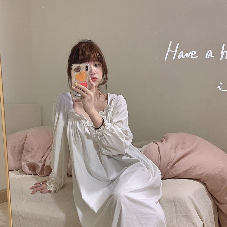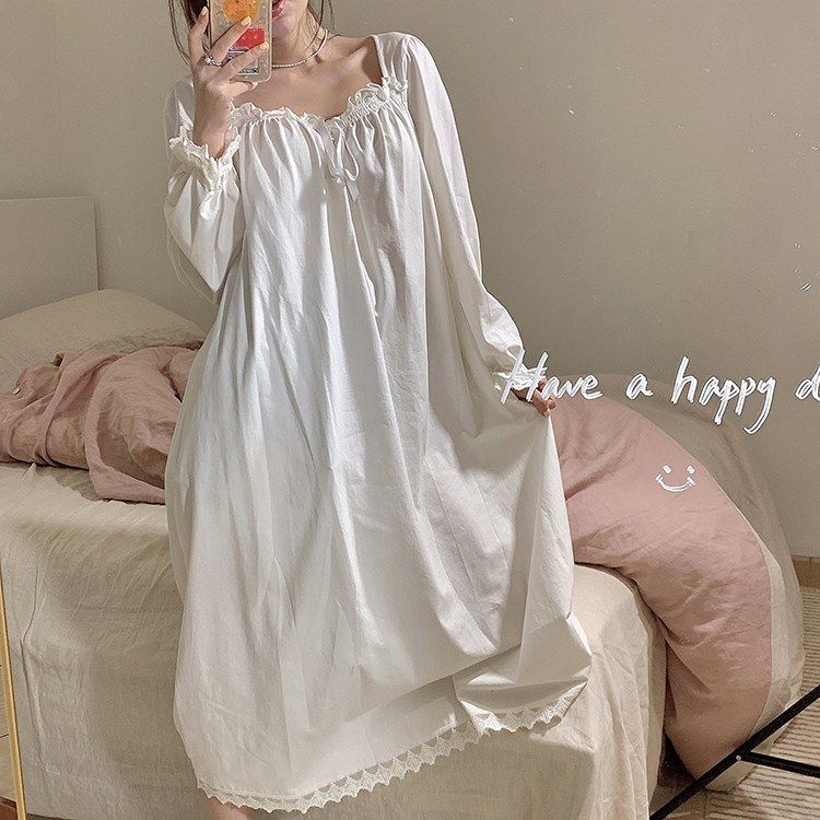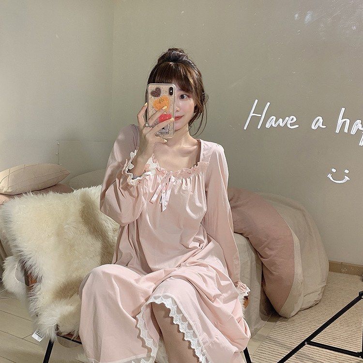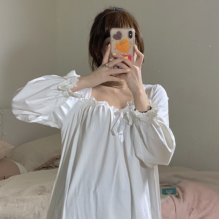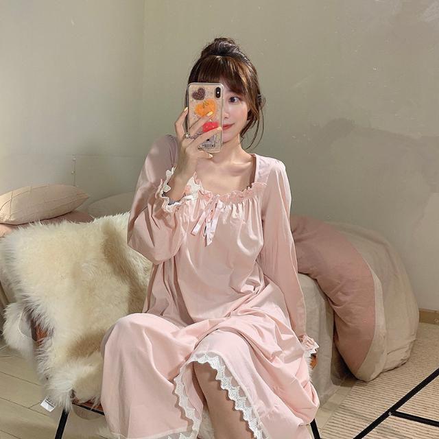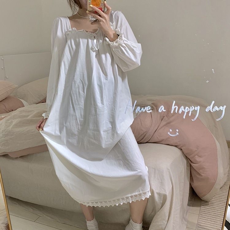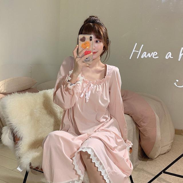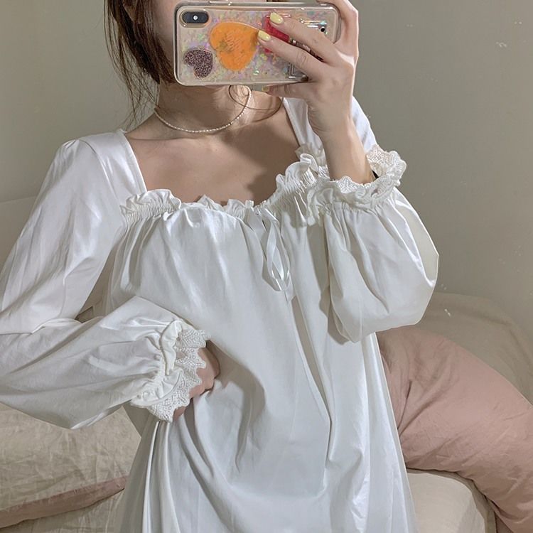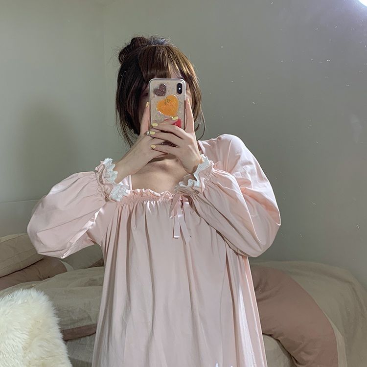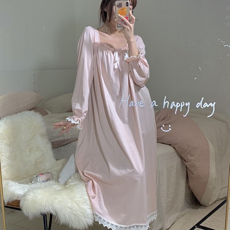 Women Nightgowns Long Sleeve Lace Sweet Square Collar Retro Midi Nightdress Loose Cozy Bow Gentle Teens Sleepwear Kawaii