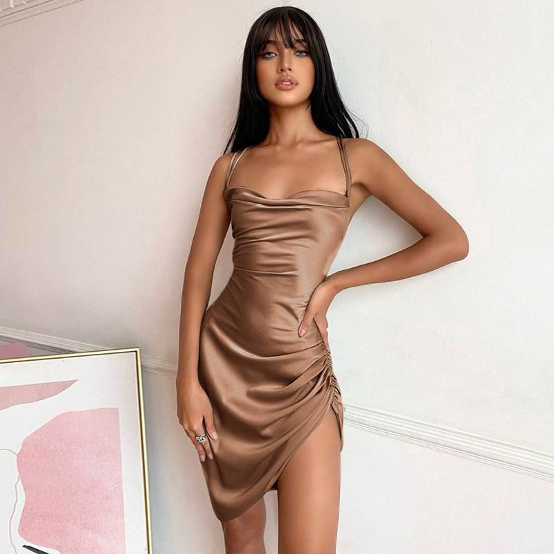 Women Satin Dress Ruched Cross Bandage Backless Bodycon Party Spaghetti Dress Hollow Out Bodycon Dress