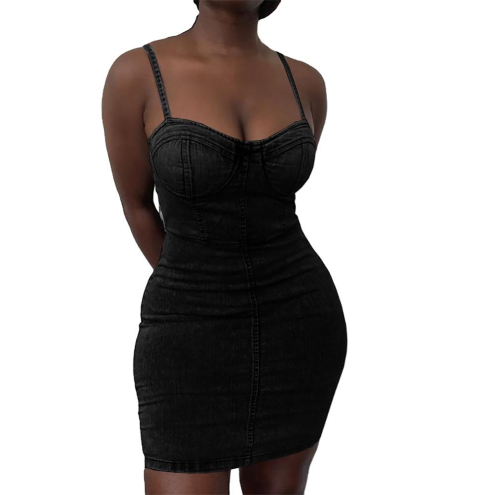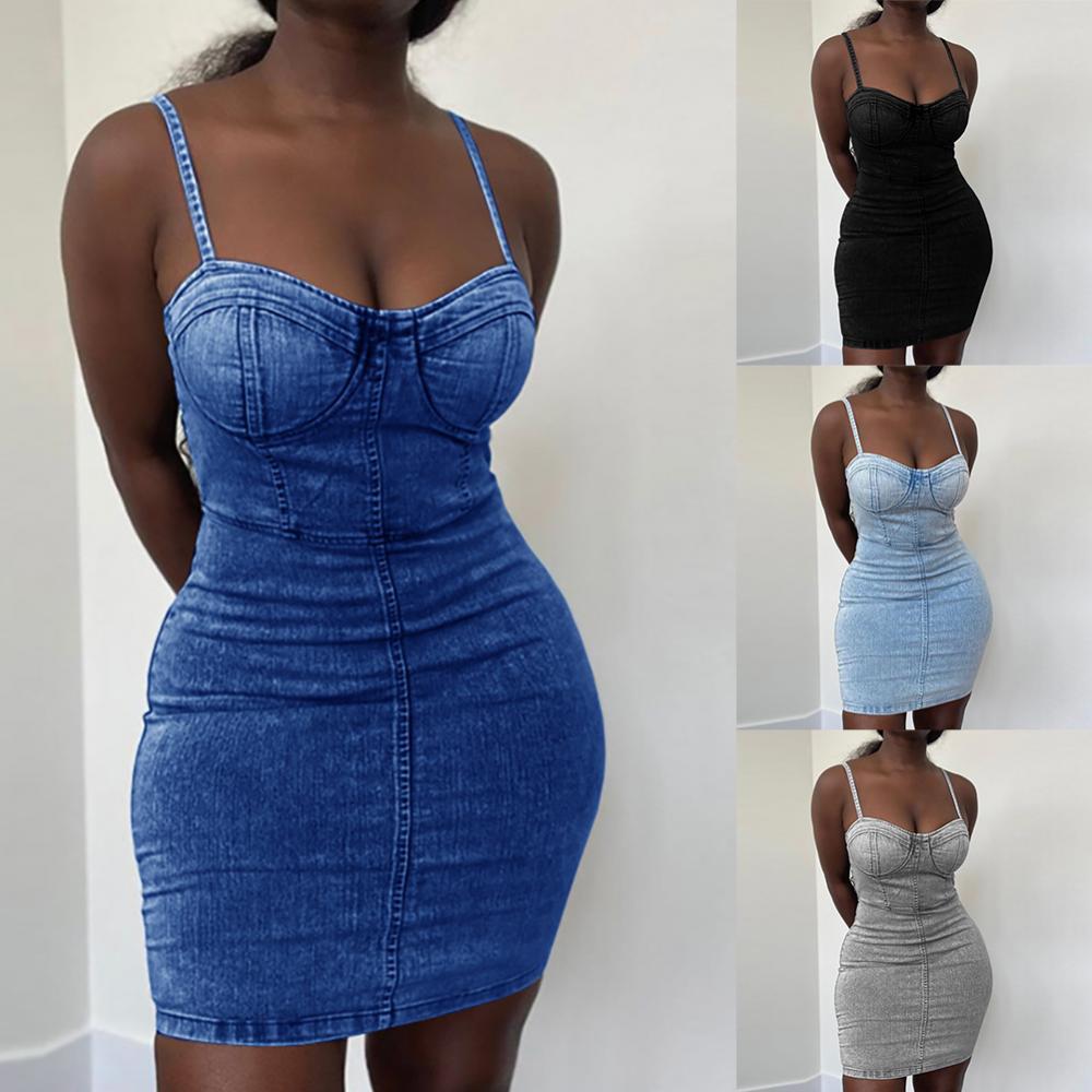 Women Sexy Solid Color Spaghetti Straps Waist Tight Bodycon Mini Denim Dress