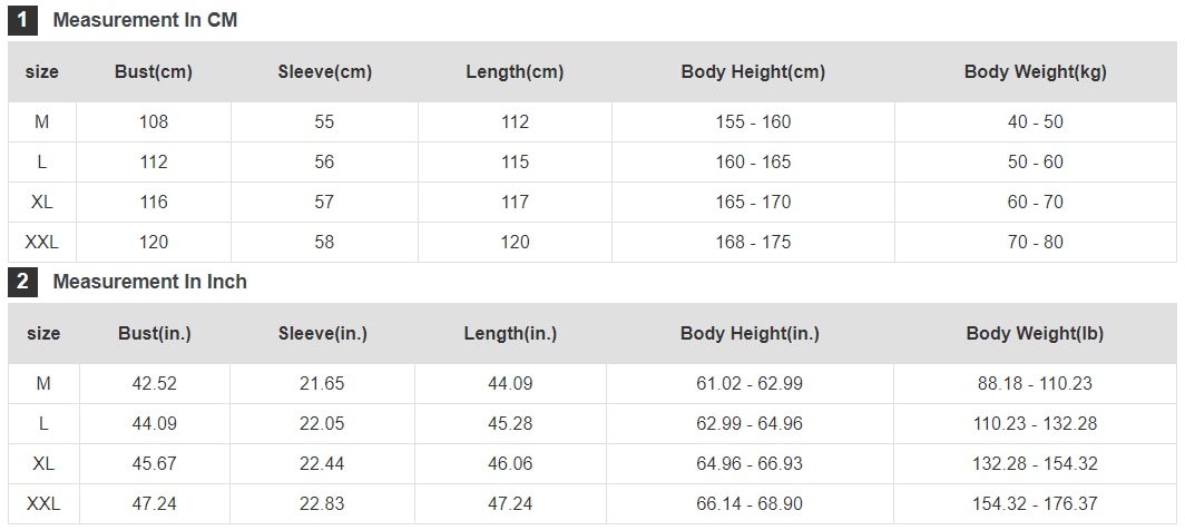 | Product Size | Bust/Chest(cm) | Length(cm) |