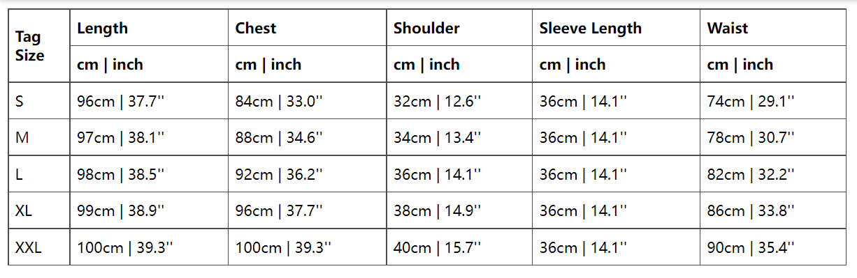 | Product Size | Bust/Chest(cm) | Skirt length(cm) |