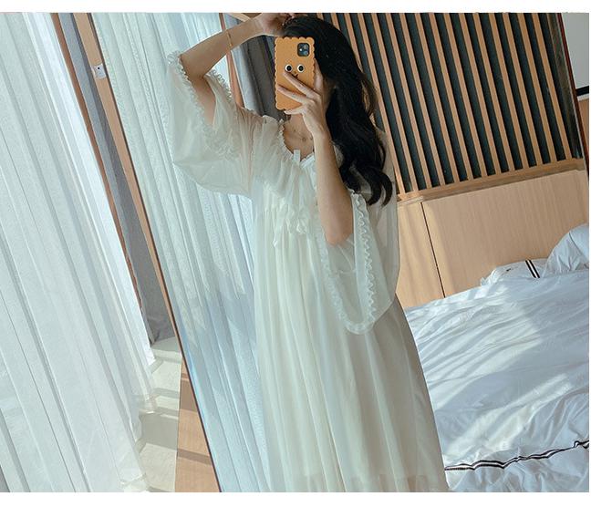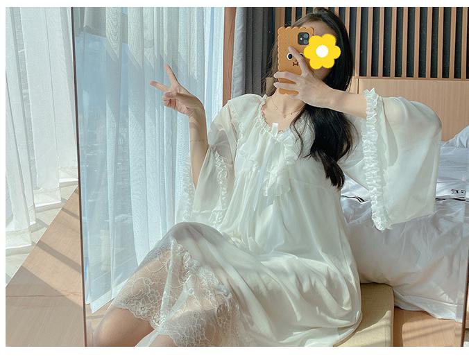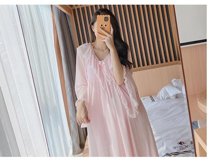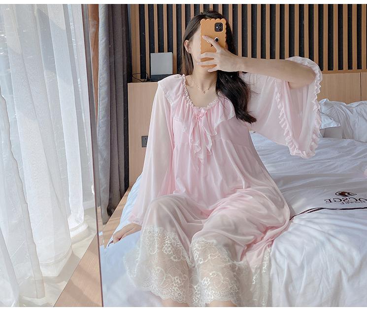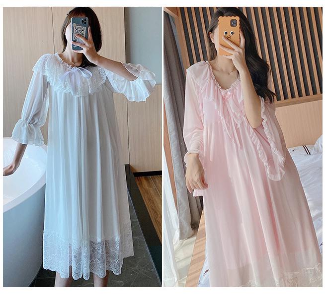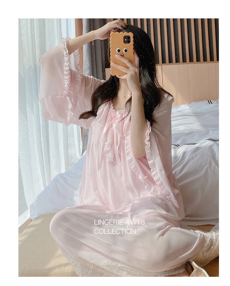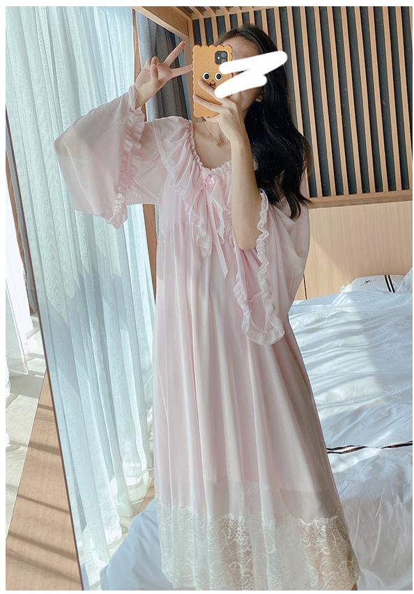 Young Lady Sweet Mesh Long Nightdress Pink Lace Bow Trim Nightgown Summer Autumn Sleepwear Dreamy Home Dress Sexy Nightwear