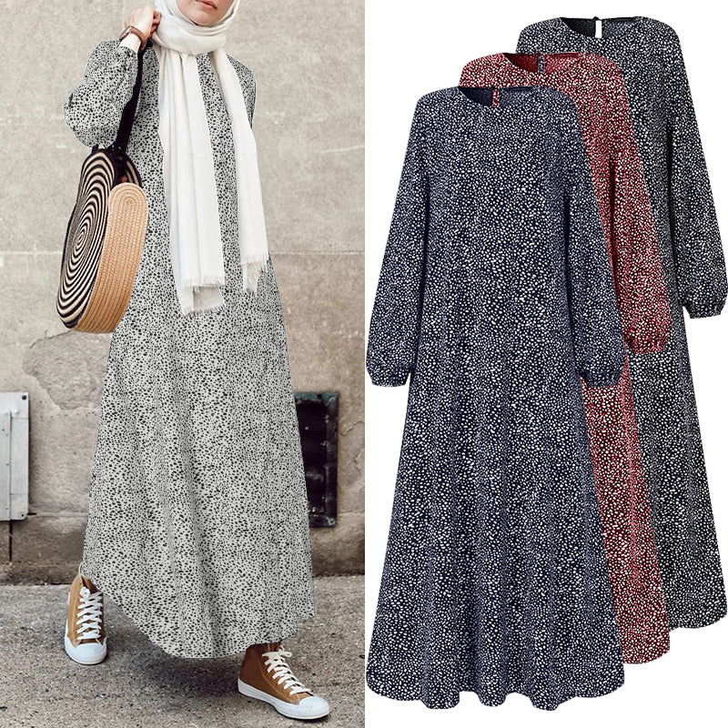 ZANZEA Women's Muslim Arabian Storm Dot Print Simple Temperament Long Skirt Round Neck Bubble Long Sleeve Fashion Loose Casual Long H-shaped Dress Without Headscarf BIG SALE